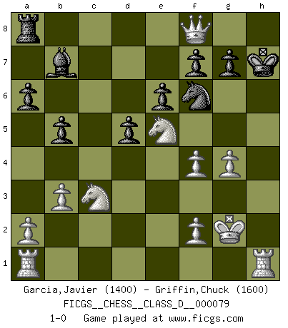 Last move : 1-0 2008 April 29 15:28:1 [Event "FICGS__CHESS__CLASS_D__000079"] [Site "FICGS"] [Date "2008.02.07"] [Round "1"] [White "Garcia,Javier"] [Black "Griffin,Chuck"] [Result "1-0"] [WhiteElo "1400"] [BlackElo "1600"] 1.d4 d5 2.Nf3 c6 3.Bf4 Nd7 4.e3 e6 5.c4 Ngf6 6.Nc3 Bb4 7.cxd5 cxd5 8.Qb3 Qb6 9.Bd3 O-O 10.O-O Ng4 11.Qd1 Ndf6 12.h3 Bd6 13.hxg4 Bxf4 14.exf4 Nxg4 15.b3 a6 16.Ne5 Qxd4 17.Bxh7+ Kxh7 18.Qxd4 Nf6 19.g4 b5 20.Qc5 Ne4 21.Qxf8 Nf6 22.Kg2 Bb7 23.Rh1+ 1-0 Queen's pawn game Kingside Castling by player Black (move 9) Kingside Castling by player White (move 10) Player White won this chess game. Follow this game move after move (download)The most powerful weapon in Chess is to have the next move. (David Bronstein) Ich organisiere ein großes Turnier, was mich etwa 120000 Dollar kostet. Ich denke, das ist das erste Mal in der Schachgeschichte, daß ein Schachgroßmeister auch als Mäzen auftritt. (Miguel Najdorf) El Ajedrez te enseña a controlarl la excitación inicial que sientes cuando vez algo que parece bueno y te enseña a pensar objetivamente cuando te encuentras en problemas. (Stanley Kubrick) Que feriez-vous si vous étiez en train de jouer aux échecs et que la fin du monde arrive ? Je continuerais à jouer. (Saint Borromée) He who laughs last probably does not get the joke. (Unknown)