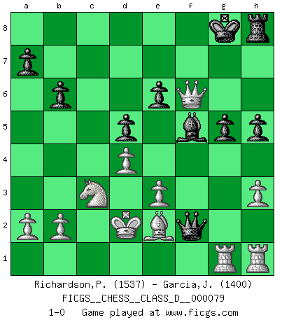 Last move : 1-0 2008 March 23 17:40:10 [Event "FICGS__CHESS__CLASS_D__000079"] [Site "FICGS"] [Date "2008.02.07"] [Round "1"] [White "Richardson,Patrick"] [Black "Garcia,Javier"] [Result "1-0"] [WhiteElo "1537"] [BlackElo "1400"] 1.d4 d5 2.c4 c6 3.Nf3 Nf6 4.Nc3 Bf5 5.cxd5 cxd5 6.Qb3 b6 7.Bf4 Nc6 8.e3 e6 9.Bb5 Rc8 10.Ne5 Be7 11.Nxc6 Rxc6 12.Bxc6+ Kf8 13.Be5 Nh5 14.h3 f6 15.Bh2 Bd6 16.Bxd6+ Qxd6 17.Bb5 Ng3 18.fxg3 Qxg3+ 19.Kd2 Qxg2+ 20.Be2 h5 21.Qa3+ Kg8 22.Rag1 Qf2 23.Qe7 g5 24.Qxf6 1-0 QGD Slav : 4.Nc3 Player White won this chess game. Follow this game move after move (download)Chess is a terrific way for kids to build self image and self esteem. (Saudin Robovic) Das Blackmar-Diemer-Gambit verändert den ganzen Menschen! (Emil Joseph Diemer) Yo considero que Fischer es uno de los expertos mas grandes de aperturas de siempre. (Keith Hayward) Aux échecs, les retours au sommet sont rares : les dommages psychologiques consécutifs à une défaite sont trop sévères. (Daily Telegraph) Chess is as much a mystery as women. (Purdy)