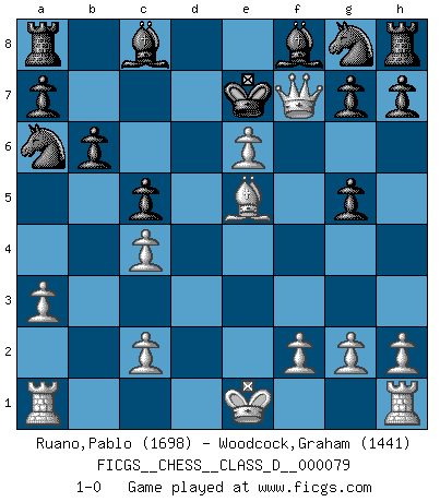 Last move : 1-0 2008 June 25 0:41:26 [Event "FICGS__CHESS__CLASS_D__000079"] [Site "FICGS"] [Date "2008.02.07"] [Round "1"] [White "Ruano,Pablo"] [Black "Woodcock,Graham"] [Result "1-0"] [WhiteElo "1698"] [BlackElo "1441"] 1.e4 c5 2.Nf3 Nc6 3.d4 e6 4.Nc3 Qb6 5.d5 Nb4 6.a3 Na6 7.Bc4 Nc7 8.Na4 Qa5+ 9.Bd2 Qxa4 10.b3 Qxc4 11.bxc4 b6 12.Bf4 d6 13.e5 dxe5 14.Bxe5 Na6 15.Ng5 f6 16.dxe6 fxg5 17.Qh5+ Ke7 18.Qf7+ 1-0 Sicilian defense Player White won this chess game. Follow this game move after move (download)I am still a victim of Chess. It has all the beauty of art and much more. It cannot be commercialized. Chess is much purer than art in its social position. (Marcel Duchamp) Wenn man heute mit 14 Jahren noch kein GM ist, kann man es vergessen. (Viswanathan Anand) Por esta medida (el intervalo entre Fischer y sus contemporaneos), yo le considero el mas grande campeón mundial. (Garry Kasparov) RxDa4 pat (...) When you have everything, sometimes it feels like nothing. (Horatio Caine, C.S.I. Miami)