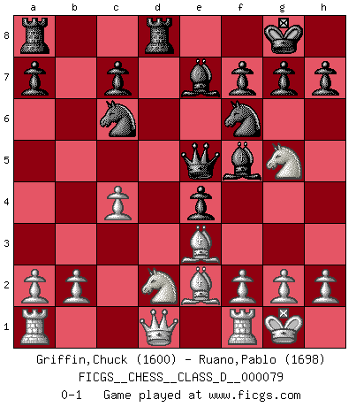 Last move : 0-1 2008 June 20 0:48:51 [Event "FICGS__CHESS__CLASS_D__000079"] [Site "FICGS"] [Date "2008.02.07"] [Round "1"] [White "Griffin,Chuck"] [Black "Ruano,Pablo"] [Result "0-1"] [WhiteElo "1600"] [BlackElo "1698"] 1.e4 e5 2.Nf3 Nc6 3.c3 Nf6 4.d3 d5 5.Nbd2 Be7 6.exd5 Qxd5 7.Nc4 O-O 8.Be3 Rd8 9.Be2 b5 10.Ncd2 Bf5 11.c4 bxc4 12.dxc4 Qe6 13.O-O e4 14.Ng5 Qe5 0-1 This chess game has been lost on time (started : 2008.02.07 10:14:55) Ponziani : Jaenisch counter-attack Kingside Castling by player Black (move 7) Kingside Castling by player White (move 13) Player Black won this chess game. Follow this game move after move (download)A Chess game is divided into three stages: the first, when you hope you have the advantage, the second when you believe you have an advantage, and the third... when you know you're going to lose ! (Savielly Tartakower) Wenn du gegen Bobby spielst, ist es keine Frage von gewinnen oder verlieren. Es ist eine Frage des Überlebens. (Boris Vassilievich Spassky) Existen dos clases de sacrificios: los correctos y los míos. (Mikhail Tal) Toutes les manuvres exécutées sur une colonne ouverte ont pour but ultime l'intrusion définitive sur la septième ou la huitième rangée, en plein cur de la position ennemie. (Aaron Nimzovitch) It's unlucky to be superstitious. (Dave Enteles)