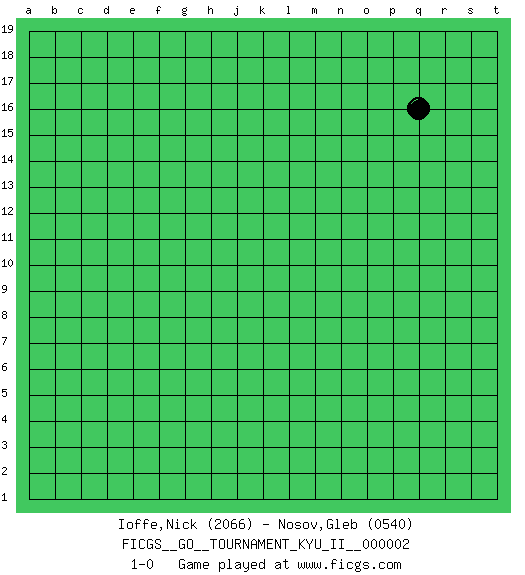 Last move : 1-0 2008 March 26 5:5:45 [Event "FICGS__GO__TOURNAMENT_KYU_II__000002"] [Site "FICGS"] [Date "2008.02.09"] [Round "1"] [Black "Ioffe,Nick"] [White "Nosov,Gleb"] [Result "1-0"] [Rating 1 "2066"] [Rating 2 "0540"] 1.q16 1-0 This go game has been lost on time (started : 2008.02.09 13:0:43) Here are the names of the openings (joseki) played in the four corners : Player Black won this Go (weiqi, baduk) game. Follow this game move after move (download)The intersection is rarely neutral. (Pierre Audouard) Creativity is inventing, experimenting, growing, taking risks, breaking rules, making mistakes, and having fun. (Mary Lou Cook)