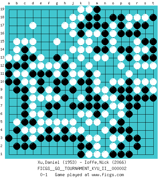 Last move : 0-1 2008 April 29 12:19:9 [Event "FICGS__GO__TOURNAMENT_KYU_II__000002"] [Site "FICGS"] [Date "2008.02.09"] [Round "1"] [Black "Xu,Daniel"] [White "Ioffe,Nick"] [Result "0-1"] [Rating 1 "1953"] [Rating 2 "2066"] 1.q16 d17 2.q4 c4 3.e3 g4 4.c3 b3 5.b2 d3 6.c2 e4 7.d2 d4 8.b4 b5 9.a3 d10 10.k16 d15 11.q10 o3 12.m4 o5 13.q6 o7 14.j3 j5 15.g3 k14 16.j7 q2 17.l7 m5 18.l4 l5 19.k10 o10 20.p8 o8 21.p9 m9 22.l9 m11 23.g7 g5 24.g9 g11 25.c6 d7 26.c5 e6 27.k12 m13 28.n16 q17 29.r16 o17 30.n17 s18 31.r17 r18 32.p17 q18 33.p18 h17 34.b10 c10 35.b9 b11 36.c8 d8 37.j13 j14 38.g13 g15 39.c12 d12 40.d13 e13 41.b12 d14 42.c13 f12 43.j9 k8 44.l8 k6 45.k7 f8 46.h10 j11 47.h11 k11 48.l11 l12 49.l10 j12 50.h12 k13 51.h8 h13 52.g10 p12 53.r3 r12 54.s17 o16 55.o18 o15 56.n15 o14 57.p16 s10 58.s8 c11 59.a11 b14 60.r2 m2 61.f3 d6 62.c7 k4 63.k3 l3 64.l2 m3 65.k2 k18 66.m18 s14 67.s15 r9 68.r7 p7 69.q8 l16 70.l17 l15 71.k17 j17 72.s13 r14 73.t14 s12 74.p2 p3 75.q3 o2 76.q1 g12 77.e10 d9 78.e9 p10 79.q9 q11 80.s9 r10 81.n14 n13 82.q14 r13 83.p14 p13 84.t13 t12 85.t15 r15 86.t18 t9 87.r8 m10 88.l18 j18 89.h4 h5 90.f7 e8 91.e11 e12 92.p4 j4 93.h3 a13 94.a12 j16 95.o4 n4 96.p5 p6 97.q7 m7 98.m8 l6 99.n7 n8 100.m6 n6 101.m7 l1 102.k1 m1 103.o9 n9 104.c14 c15 105.c9 l19 106.m19 k19 107.m14 l14 108.t8 t10 109.o1 n1 110.p1 m16 111.m17 k15 112.q13 b13 113.a10 b15 114.f6 g8 115.f4 f5 116.d5 j10 117.d11 e5 118.f11 f9 0-1 Here are the names of the openings (joseki) played in the four corners : Corner d4 : c4 e3 Komoku (Somok, Xiao~mu`) 3-4 Point. The komoku (3-4) point is the traditional corner enclosure move.. Ikken Kakari (Hankan Keolch'im, Yi Gua`jiao~, 1-Space Low Pincer). The small knight move is the basic approach move to the 3-4 point stone. It has been continually used for over four centuries. There are limitless variations, with new moves constantly being discovered. Black 2 opens the door to a treaure store of joseki. Corner q4 : q4 o3 Hoshi (Hwajeom, Seongjeom, Xingwei`) 4-4 Point. The star or hoshi (4-4) point, emphasizing influence at the potential expense of territory. Ikken Kakari (Hankan Keolch'im, Yi Gua`jiao~, 1-Space Low Approach). White 2 is the standard approach move to the 4-4. Corner q16 : q16 m11 Hoshi (Hwajeom, Seongjeom, Xingwei`) 4-4 Point. The star or hoshi (4-4) point, emphasizing influence at the potential expense of territory. Player White won this Go (weiqi, baduk) game. Follow this game move after move (download)Go is not a blocking game, it's a game of action. (Pierre Audouard) Somehow our devils are never quite what we expect when we meet them face to face. (Nelson DeMille)