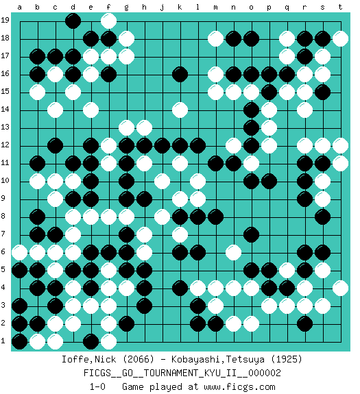 Last move : 1-0 2008 May 14 15:50:50 [Event "FICGS__GO__TOURNAMENT_KYU_II__000002"] [Site "FICGS"] [Date "2008.02.09"] [Round "1"] [Black "Ioffe,Nick"] [White "Kobayashi,Tetsuya"] [Result "1-0"] [Rating 1 "2066"] [Rating 2 "1925"] 1.q16 r4 2.d16 d4 3.k16 c14 4.c12 e14 5.f16 c16 6.c17 d15 7.b17 e16 8.d17 e17 9.e18 f17 10.f18 g17 11.p4 m4 12.r5 s5 13.s4 s3 14.s6 t4 15.r6 p3 16.o3 q3 17.o5 r14 18.r11 r16 19.r17 s17 20.s18 q17 21.r18 q15 22.p16 s16 23.p15 p14 24.o14 p13 25.o13 p12 26.p10 c10 27.e12 g13 28.d9 d10 29.e10 c9 30.d11 d8 31.e9 f11 32.e11 e8 33.g9 f8 34.g10 h7 35.h3 f3 36.h5 g4 37.l3 m3 38.m2 n2 39.l2 o2 40.n3 l4 41.k4 q5 42.q4 o4 43.p5 n4 44.k6 j8 45.k8 k9 46.l8 j10 47.h12 h13 48.j12 k14 49.l12 k11 50.k12 o15 51.o16 n15 52.n16 m15 53.n11 n6 54.o7 n12 55.m11 o11 56.o10 m16 57.n18 m18 58.o18 g18 59.b16 b15 60.o12 f19 61.d19 s12 62.c4 c5 63.d5 c6 64.c3 d3 65.e5 c2 66.g5 f5 67.f6 f4 68.g7 g8 69.e6 s10 70.r9 s9 71.s11 t11 72.s8 r12 73.r10 t12 74.b2 d2 75.c7 d7 76.b5 b6 77.b4 b1 78.g2 f2 79.e1 f1 80.e4 e3 81.h4 a2 82.a3 b3 83.r2 r3 84.b2 h6 85.g6 b3 86.s15 r15 87.b2 t18 88.a1 c1 89.a5 a2 90.b7 d6 91.a1 q18 92.a2 a6 93.b11 b10 94.b8 h11 95.g12 f12 96.g11 k7 97.l6 l9 98.m8 l10 99.h9 1-0 Here are the names of the openings (joseki) played in the four corners : Corner d16 : d16 c14 Hoshi (Hwajeom, Seongjeom, Xingwei`) 4-4 Point. The star or hoshi (4-4) point, emphasizing influence at the potential expense of territory. Ikken Kakari (Hankan Keolch'im, Yi Gua`jiao~, 1-Space Low Approach). White 2 is the standard approach move to the 4-4. Corner q4 : r4 p4 Komoku (Somok, Xiao~mu`) 3-4 Point. The komoku (3-4) point is the traditional corner enclosure move.. Ikken Takagakari (Hankan Nop'dakeolch'im, Yi Gaogua`jiao~, 1-Space High Approach). The 5-4 approach move has become more popular in modern times, as modern Go emphasizes speed and influence. Corner q16 : q16 r14 Hoshi (Hwajeom, Seongjeom, Xingwei`) 4-4 Point. The star or hoshi (4-4) point, emphasizing influence at the potential expense of territory. Ikken Kakari (Hankan Keolch'im, Yi Gua`jiao~, 1-Space Low Approach). White 2 is the standard approach move to the 4-4. Corner d4 : d4 d9 Hoshi (Hwajeom, Seongjeom, Xingwei`) 4-4 Point. The star or hoshi (4-4) point, emphasizing influence at the potential expense of territory. Player Black won this Go (weiqi, baduk) game. Follow this game move after move (download)If your stone is capped, play the knight's move. (Anonymous) At last I discovered the true beauty of chess. So I proposed to her. (Dinesh De Silva)