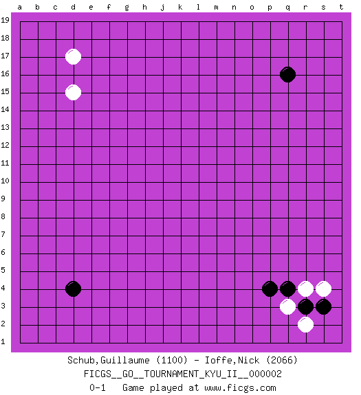 Last move : 0-1 2008 April 11 19:24:30 [Event "FICGS__GO__TOURNAMENT_KYU_II__000002"] [Site "FICGS"] [Date "2008.02.09"] [Round "1"] [Black "Schub,Guillaume"] [White "Ioffe,Nick"] [Result "0-1"] [Rating 1 "1100"] [Rating 2 "2066"] 1.q16 d17 2.d4 r4 3.p4 d15 4.r3 q3 5.q4 r2 6.s3 s4 0-1 This go game has been lost on time (started : 2008.02.09 13:0:43) Here are the names of the openings (joseki) played in the four corners : Corner q4 : r4 p4 Komoku (Somok, Xiao~mu`) 3-4 Point. The komoku (3-4) point is the traditional corner enclosure move.. Ikken Takagakari (Hankan Nop'dakeolch'im, Yi Gaogua`jiao~, 1-Space High Approach). The 5-4 approach move has become more popular in modern times, as modern Go emphasizes speed and influence. Player White won this Go (weiqi, baduk) game. Follow this game move after move (download)Be a little patient. Keshi works ! (Anonymous) I take risks, sometimes patients die, but not taking risks causes more patients to die. So I guess my biggest problem is I've been cursed with the ability to do the math. (Gregory House, House M.D.)