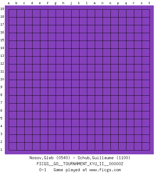Last move : 0-1 2008 March 12 3:56:35 [Event "FICGS__GO__TOURNAMENT_KYU_II__000002"] [Site "FICGS"] [Date "2008.02.09"] [Round "1"] [Black "Nosov,Gleb"] [White "Schub,Guillaume"] [Result "0-1"] [Rating 1 "0540"] [Rating 2 "1100"] 0-1 This go game has been lost on time (started : 2008.02.09 13:0:43) Here are the names of the openings (joseki) played in the four corners : Player White won this Go (weiqi, baduk) game. Follow this game move after move (download)Attach to the strongest stone in a pincer. (Anonymous) The right perception of any matter and a misunderstanding of the same matter do not wholly exclude each other. (Kafka's the trial)