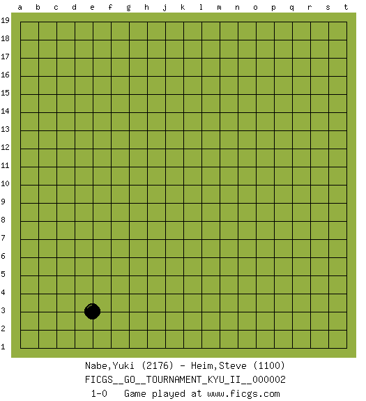 Last move : 1-0 2008 March 12 3:56:35 [Event "FICGS__GO__TOURNAMENT_KYU_II__000002"] [Site "FICGS"] [Date "2008.02.09"] [Round "1"] [Black "Nabe,Yuki"] [White "Heim,Steve"] [Result "1-0"] [Rating 1 "2176"] [Rating 2 "1100"] 1.e3 1-0 This go game has been lost on time (started : 2008.02.09 13:0:43) Here are the names of the openings (joseki) played in the four corners : Corner d4 : e3 1-0 Mokuhazushi (Waemok, Wai`mu`) 5-3 Point. The mokuhazushi (5-3) point was popular in the Edo period in Japan (1600 - 1867). It emphasizes influence; territorially, it is inferior to the 3-4 point. Player Black won this Go (weiqi, baduk) game. Follow this game move after move (download)Beware of the clumsy double contact. (Anonymous) Computers make it easier to do a lot of things, but most of the things they make it easier to do don't need to be done. (Andy Rooney)
