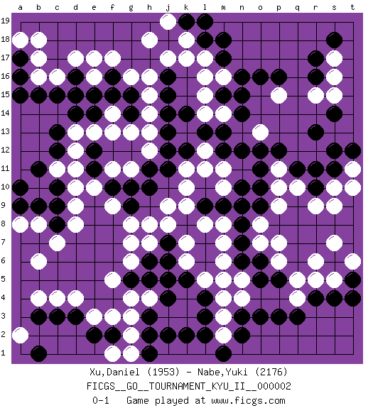 Last move : 0-1 2008 May 14 9:42:35 [Event "FICGS__GO__TOURNAMENT_KYU_II__000002"] [Site "FICGS"] [Date "2008.02.09"] [Round "1"] [Black "Xu,Daniel"] [White "Nabe,Yuki"] [Result "0-1"] [Rating 1 "1953"] [Rating 2 "2176"] 1.r16 d4 2.q3 c16 3.p16 r9 4.r11 r5 5.r4 q5 6.o3 q10 7.q11 k17 8.c10 c7 9.c13 e17 10.m17 h16 11.m15 k3 12.d3 e3 13.c3 c4 14.e2 f3 15.f2 g3 16.b3 b4 17.o11 s16 18.r17 s17 19.s18 r15 20.s14 s15 21.r13 p15 22.o16 o13 23.n12 m14 24.m13 l14 25.n14 l15 26.n15 p11 27.p12 p10 28.o12 n4 29.n9 o8 30.n8 o7 31.n3 m4 32.b15 b16 33.c15 d12 34.e11 d13 35.d16 d17 36.c12 d11 37.d14 d10 38.c9 d8 39.k8 h8 40.j7 h7 41.j5 h4 42.h6 g6 43.e14 f13 44.h11 f11 45.k12 j9 46.s4 k10 47.l13 k11 48.j12 m10 49.n10 l8 50.l7 m7 51.l18 k18 52.a16 b17 53.l9 m8 54.m9 k9 55.n7 m6 56.n6 n5 57.o6 p6 58.s6 s5 59.t5 s7 60.o5 r6 61.l6 m5 62.l3 m3 63.l2 m2 64.h2 k4 65.k2 j3 66.j2 g2 67.l4 l5 68.k5 k6 69.h3 k7 70.j4 f1 71.b1 a2 72.k19 j19 73.l19 h18 74.a17 a18 75.a15 b18 76.j6 j8 77.h1 g1 78.n2 s10 79.g5 f5 80.s11 b8 81.b9 e16 82.g10 f9 83.e12 e13 84.j14 l17 85.m18 h13 86.j13 h12 87.j11 g11 88.h10 h14 89.f15 t6 90.t4 q4 91.p3 g16 92.f10 e10 93.j16 j17 94.j15 c11 95.b11 d9 96.a10 a8 97.a9 g4 98.h5 g7 99.f16 f17 100.o9 p9 101.p5 p7 102.r10 s9 103.c8 b6 104.d15 f14 105.g15 m11 106.k14 m16 107.n16 l16 108.g14 g13 109.g9 g8 110.m1 t11 111.t12 t10 112.s12 h15 113.e15 l12 114.m12 l11 115.o10 pass 116.pass pass 117.pass pass 118.pass 0-1 Here are the names of the openings (joseki) played in the four corners : Corner q4 : q3 r9 Komoku (Somok, Xiao~mu`) 3-4 Point. The komoku (3-4) point is the traditional corner enclosure move.. Corner d16 : c16 c13 Komoku (Somok, Xiao~mu`) 3-4 Point. The komoku (3-4) point is the traditional corner enclosure move.. Player White won this Go (weiqi, baduk) game. Follow this game move after move (download)Each step in a ladder is worth 7 points. (Anonymous) I would love to change the world, but they won't give me the source code. (Unknown)