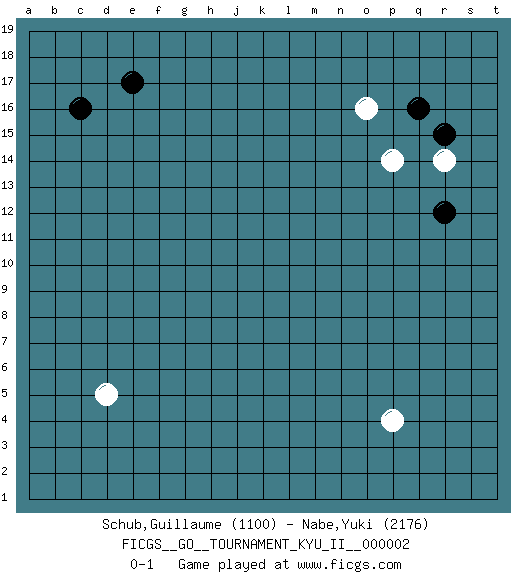 Last move : 0-1 2008 April 13 7:33:13 [Event "FICGS__GO__TOURNAMENT_KYU_II__000002"] [Site "FICGS"] [Date "2008.02.09"] [Round "1"] [Black "Schub,Guillaume"] [White "Nabe,Yuki"] [Result "0-1"] [Rating 1 "1100"] [Rating 2 "2176"] 1.q16 d5 2.c16 p4 3.e17 r14 4.r12 p14 5.r15 o16 0-1 This go game has been lost on time (started : 2008.02.09 13:0:43) Here are the names of the openings (joseki) played in the four corners : Corner q16 : q16 r14 Hoshi (Hwajeom, Seongjeom, Xingwei`) 4-4 Point. The star or hoshi (4-4) point, emphasizing influence at the potential expense of territory. Ikken Kakari (Hankan Keolch'im, Yi Gua`jiao~, 1-Space Low Approach). White 2 is the standard approach move to the 4-4. Corner q4 : p4 0-1 Takamoku (Gomok, Gaomu`) 5-4 Point. The takamoku (high) point (5-4). With its emphasis on influence, the 5-4 point complements the 4-4 (hoshi) point in creating an influence-oriented fuseki. Player White won this Go (weiqi, baduk) game. Follow this game move after move (download)Knight's moves win running battles. (Anonymous) There are two types of people in this world, good and bad. The good sleep better, but the bad seem to enjoy the waking hours much more. (Woody Allen)