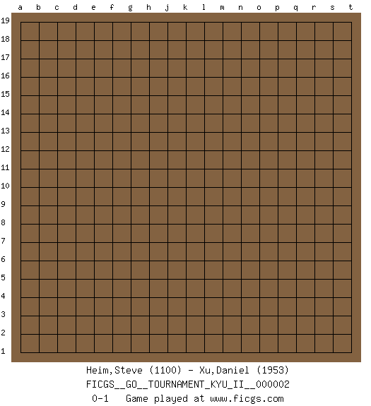 Last move : 0-1 2008 March 12 3:56:35 [Event "FICGS__GO__TOURNAMENT_KYU_II__000002"] [Site "FICGS"] [Date "2008.02.09"] [Round "1"] [Black "Heim,Steve"] [White "Xu,Daniel"] [Result "0-1"] [Rating 1 "1100"] [Rating 2 "1953"] 0-1 This go game has been lost on time (started : 2008.02.09 13:0:43) Here are the names of the openings (joseki) played in the four corners : Player White won this Go (weiqi, baduk) game. Follow this game move after move (download)If there is no stone on the handicap point, the carpenter's square is dead. (Anonymous) You can't play chess if you're groggy from pills. (Anatoly Karpov)