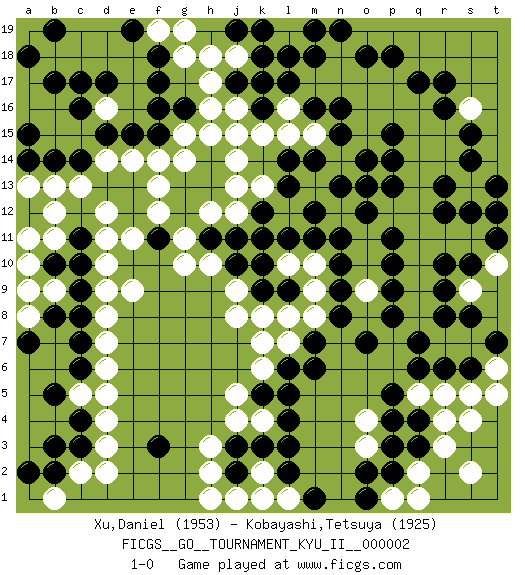 Last move : 1-0 2008 May 27 14:28:50 [Event "FICGS__GO__TOURNAMENT_KYU_II__000002"] [Site "FICGS"] [Date "2008.02.09"] [Round "1"] [Black "Xu,Daniel"] [White "Kobayashi,Tetsuya"] [Result "1-0"] [Rating 1 "1953"] [Rating 2 "1925"] 1.q17 d4 2.q4 d16 3.f3 j4 4.c6 d6 5.c3 d3 6.c4 c5 7.b5 d5 8.c7 d7 9.c8 o3 10.q6 c2 11.b2 d2 12.l4 k6 13.j3 h3 14.k3 h2 15.p3 o4 16.l6 r3 17.q3 l7 18.m6 k7 19.o7 r15 20.r13 q16 21.r17 p17 22.p18 o17 23.o18 n17 24.p13 s4 25.r6 q2 26.p2 s2 27.c14 d14 28.c17 c15 29.d17 c13 30.f17 r11 31.r9 s13 32.s14 r14 33.s12 q13 34.r12 q12 35.s15 h17 36.g16 j15 37.m12 m10 38.n11 o9 39.p11 s11 40.t13 q11 41.p10 q9 42.p9 q8 43.p8 e9 44.g12 p1 45.o1 q1 46.o2 g11 47.h11 h10 48.f11 g10 49.j11 f12 50.j10 j9 51.g13 f13 52.c11 b16 53.b17 b11 54.b10 b12 55.c10 e11 56.m18 n18 57.n19 m17 58.l18 k17 59.m14 m15 60.l14 a17 61.a18 a16 62.b19 l1 63.l2 k1 64.m1 j1 65.n10 m9 66.n9 g18 67.f18 a10 68.a9 a11 69.k5 j5 70.r8 q10 71.p14 q14 72.p15 p16 73.l17 l16 74.k18 j18 75.k16 k15 76.j17 j16 77.k17 l15 78.m19 h16 79.h14 n14 80.n13 o15 81.n16 s9 82.s8 t10 83.r10 g15 84.f16 g14 85.h13 h15 86.e15 e14 87.f15 f14 88.l11 b9 89.b8 a8 90.a7 j13 91.k9 k8 92.l9 m8 93.m7 l8 94.n8 p12 95.o12 b1 96.b3 r5 97.s6 q5 98.p5 s5 99.q7 t6 100.t7 t5 101.c16 b15 102.d15 k4 103.l5 q15 104.o13 s16 105.r16 t12 106.t11 j14 107.t12 h12 108.b14 f19 109.e19 g19 110.j19 h18 111.c9 a9 112.s10 l10 113.k10 r4 114.p4 d8 115.k19 d12 116.n15 o16 117.o14 d10 118.k12 j12 119.k11 k13 120.m11 j8 121.l13 k2 122.l3 b13 123.a15 a13 124.a2 d9 125.j2 h1 126.m16 d11 127.a14 1-0 Here are the names of the openings (joseki) played in the four corners : Corner d4 : d4 f3 Hoshi (Hwajeom, Seongjeom, Xingwei`) 4-4 Point. The star or hoshi (4-4) point, emphasizing influence at the potential expense of territory. Ikken Kakari (Hankan Keolch'im, Yi Gua`jiao~, 1-Space Low Approach). Black 2 is the standard approach move to the 4-4. Corner q4 : q4 o3 Hoshi (Hwajeom, Seongjeom, Xingwei`) 4-4 Point. The star or hoshi (4-4) point, emphasizing influence at the potential expense of territory. Ikken Kakari (Hankan Keolch'im, Yi Gua`jiao~, 1-Space Low Approach). White 2 is the standard approach move to the 4-4. Corner q16 : q17 r15 Komoku (Somok, Xiao~mu`) 3-4 Point. The komoku (3-4) point is the traditional corner enclosure move.. Ikken Kakari (Hankan Keolch'im, Yi Gua`jiao~, 1-Space Low Pincer). The small knight move is the basic approach move to the 3-4 point stone. It has been continually used for over four centuries. There are limitless variations, with new moves constantly being discovered. White 2 opens the door to a treaure store of joseki. Corner d16 : d16 c14 Hoshi (Hwajeom, Seongjeom, Xingwei`) 4-4 Point. The star or hoshi (4-4) point, emphasizing influence at the potential expense of territory. Ikken Kakari (Hankan Keolch'im, Yi Gua`jiao~, 1-Space Low Approach). Black 2 is the standard approach move to the 4-4. Player Black won this Go (weiqi, baduk) game. Follow this game move after move (download)Everything happens on a grid-engraved board with black and white pieces, but if that's all you see then you don't know Go. (Pierre Audouard) There's always a bigger fish. (Qui-Gon Jinn in Star Wars ep.1)