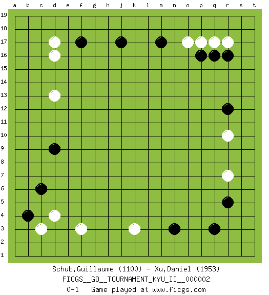 Last move : 0-1 2008 April 2 6:50:57 [Event "FICGS__GO__TOURNAMENT_KYU_II__000002"] [Site "FICGS"] [Date "2008.02.09"] [Round "1"] [Black "Schub,Guillaume"] [White "Xu,Daniel"] [Result "0-1"] [Rating 1 "1100"] [Rating 2 "1953"] 1.q16 d4 2.q3 d16 3.r5 k3 4.c6 f3 5.b4 c3 6.d9 d13 7.n3 r10 8.r12 r7 9.f17 d17 10.j17 q17 11.r16 o17 12.m17 r17 13.p16 p17 0-1 This go game has been lost on time (started : 2008.02.09 13:0:43) Here are the names of the openings (joseki) played in the four corners : Corner d4 : d4 c6 Hoshi (Hwajeom, Seongjeom, Xingwei`) 4-4 Point. The star or hoshi (4-4) point, emphasizing influence at the potential expense of territory. Ikken Kakari (Hankan Keolch'im, Yi Gua`jiao~, 1-Space Low Approach). Black 2 is the standard approach move to the 4-4. Player White won this Go (weiqi, baduk) game. Follow this game move after move (download)With less than 15 stones in danger, tenuki. (Anonymous) Thus, what is of supreme importance in war is to attack the enemy's strategy. (Sun Tzu)