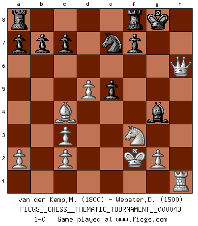 Last move : 1-0 2008 February 25 9:0:50 [Event "FICGS__CHESS__THEMATIC_TOURNAMENT__000043"] [Site "FICGS"] [Date "2008.02.09"] [Round "1"] [White "van der Kemp,Michel"] [Black "Webster,David"] [Result "1-0"] [WhiteElo "1800"] [BlackElo "1500"] 1.e4 e5 2.f4 exf4 3.Nc3 Qh4+ 4.Ke2 Nf6 5.Nf3 Qh6 6.d4 Bb4 7.e5 Nh5 8.Kf2 Bxc3 9.bxc3 Ng3 10.hxg3 Qxh1 11.Bxf4 h6 12.g4 Nc6 13.Qd2 O-O 14.d5 Ne7 15.Re1 d6 16.Bc4 Bxg4 17.Rxh1 dxe5 18.Bxh6 gxh6 19.Qxh6 1-0 KGA : Keres (Mason-Steinitz) gambit Kingside Castling by player Black (move 13) Player White won this chess game. Follow this game move after move (download)Via the squares on the chessboard, the Indians explain the movement of time and the age, the higher influences which control the world and the ties which link Chess with the human soul. (Al-Masudi) Schach ist die gewalttätigste aller Sportarten. (Garry Kasparov) Si el Ajedrez es una ciencia, es la mas inexacta. Si el Ajedrez es un arte, es demasiado inexacto para ser visto como tal. Si el Ajedrez es un deporte, es demasiado esotérico. Si el Ajedrez es un juego, es demasiado exigente para ser solo un juego. Si el Ajedrez es una aventura, es una muy demandante. Si el Ajedrez es una pasión, es una muy gratificante. Si el Ajedrez es la vida, es una muy triste. (Anónimo) Donnez-moi un Cavalier en 6e et je gagnerais toutes mes parties. (Steinitz) Hold em is to stud what chess is to checkers. (Johnny Moss)