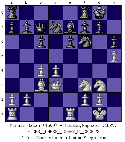 Last move : 1-0 2008 May 17 10:8:22 [Event "FICGS__CHESS__CLASS_C__000073"] [Site "FICGS"] [Date "2008.02.10"] [Round "1"] [White "Kirali,Hasan"] [Black "Rosado,Raphael"] [Result "1-0"] [WhiteElo "1600"] [BlackElo "1629"] 1.e4 c6 2.d4 d5 3.Nc3 dxe4 4.Nxe4 Bf5 5.Ng3 Bg6 6.h4 h6 7.Nf3 Nd7 8.h5 Bh7 9.Bd3 Bxd3 10.Qxd3 e6 11.Bf4 Qa5+ 12.Bd2 Bb4 13.c3 Be7 14.c4 Qc7 15.O-O Ngf6 16.Rfe1 O-O 17.Bc3 1-0 This chess game has been lost on time (started : 2008.02.10 18:25:43) Caro-Kann : Classical, 7...Nd7 Kingside Castling by player White (move 15) Kingside Castling by player Black (move 16) Player White won this chess game. Follow this game move after move (download)A player surprised is half beaten. (Proverb) Habe Mut, dich deines eigenen Verstandes zu bedienen. (Immanuel Kant) Yo nunca en mi vida he jugado la Defensa Francesa, que viene siendo la más aburrida de todas las Aperturas. (Wilhelm Steinitz) A chaque perte on perd un peu de soi. (Joël Lautier) But they are useless. They can only give you answers. (Pablo Picasso, about computers)