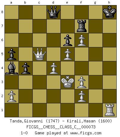 Last move : 1-0 2008 April 1 22:8:29 [Event "FICGS__CHESS__CLASS_C__000073"] [Site "FICGS"] [Date "2008.02.10"] [Round "1"] [White "Tanda,Giovanni"] [Black "Kirali,Hasan"] [Result "1-0"] [WhiteElo "1747"] [BlackElo "1600"] 1.d4 c5 2.c3 cxd4 3.cxd4 d5 4.Nc3 Nc6 5.Bf4 Nf6 6.e3 e6 7.Nf3 Bb4 8.Bd3 O-O 9.O-O Bxc3 10.bxc3 Nh5 11.Bg5 f6 12.Bh4 Qe8 13.c4 g5 14.Bg3 Nxg3 15.hxg3 Nb4 16.Bxh7+ Kg7 17.Qb1 Rh8 18.Qxb4 Rxh7 19.Rfc1 a5 20.Qd6 Ra6 21.Qa3 dxc4 22.Rxc4 Kg8 23.Rac1 Bd7 24.Rc7 Qh5 25.Kf1 Qe8 26.g4 Rh1+ 27.Ke2 Rh7 28.R1c5 b6 29.Rc1 b5 30.Qc5 b4 31.Kd2 Qd8 32.e4 Rf7 33.e5 f5 34.gxf5 g4 35.f6 gxf3 36.gxf3 Rc6 37.Rxc6 Bxc6 38.Ke3 Ba4 39.Rg1+ Kh8 40.Rh1+ 1-0 Old Benoni defense Kingside Castling by player Black (move 8) Kingside Castling by player White (move 9) Player White won this chess game. Follow this game move after move (download)The hardest game to win is a won game. (Emanuel Lasker) Mein Gehirn das ist mein zweitwichtigstes Organ [Aus dem Film: Der Schläfer]. (Woody Allen) Preferería tener un Peón que un dedo. (Reuben Fine) Le succès, c'est être capable d'aller d'échec en échec sans perdre son enthousiasme. (Winston Churchill) Tomorrow's what you make of it. (Horatio Caine, C.S.I. Miami)