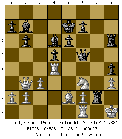 Last move : 0-1 2008 April 5 11:31:53 [Event "FICGS__CHESS__CLASS_C__000073"] [Site "FICGS"] [Date "2008.02.10"] [Round "1"] [White "Kirali,Hasan"] [Black "Kolawski,Christof"] [Result "0-1"] [WhiteElo "1600"] [BlackElo "1782"] 1.e4 e6 2.d4 d5 3.Nd2 Nf6 4.e5 Nfd7 5.Ngf3 c5 6.c3 Nc6 7.Bd3 Be7 8.O-O g5 9.dxc5 g4 10.Ne1 Ncxe5 11.Nb3 Nxc5 12.Nxc5 Bxc5 13.Bf4 Ng6 14.Qxg4 h5 15.Qg3 h4 16.Qg4 Nxf4 17.Qxf4 Bd6 18.Qd4 Rh6 19.h3 Qf6 20.Qa4+ Ke7 21.Qb3 Qf4 22.Nf3 b6 23.Rad1 Bb7 24.Be2 Rg8 25.Rd4 Qf5 26.Kh1 Rxg2 0-1 French : Tarrasch, Closed variation Kingside Castling by player White (move 8) Player Black won this chess game. Follow this game move after move (download)Chess is like war on a board. (Bobby Fischer) Ich kämpfe solange mein Gegner einen Fehler machen kann. (Emanuel Lasker) El Ajedrez es el gimnasio de la mente. (Blaise Pascal) Horreur, mais aussi harmonie suprême : qu'y avait-il en effet au monde en dehors des échecs ? Le brouillard, l'inconnu, le non-être... (Vladimir Nabokov) Once you start thinking you have nothing left to learn, you have everything to learn. (Steve Badget)