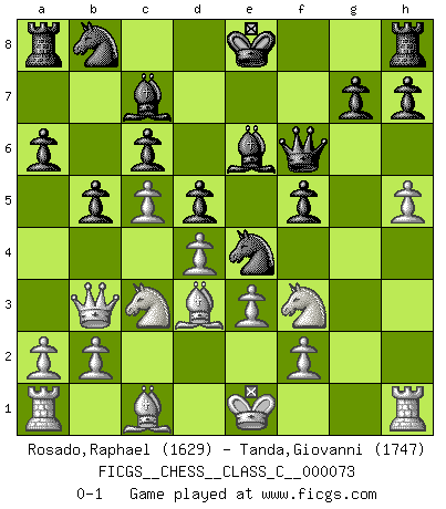 Last move : 0-1 2008 May 9 21:29:34 [Event "FICGS__CHESS__CLASS_C__000073"] [Site "FICGS"] [Date "2008.02.10"] [Round "1"] [White "Rosado,Raphael"] [Black "Tanda,Giovanni"] [Result "0-1"] [WhiteElo "1629"] [BlackElo "1747"] 1.d4 d5 2.Nf3 e6 3.e3 c6 4.c4 f5 5.Nc3 Nf6 6.Bd3 Bd6 7.h3 a6 8.g4 b5 9.c5 Bc7 10.gxf5 exf5 11.h4 Ne4 12.h5 Qf6 13.Qb3 Be6 0-1 This chess game has been lost on time (started : 2008.02.10 18:25:43) Queen's pawn game Player Black won this chess game. Follow this game move after move (download)Strategy requires thought, tactics require observation. (Max Euwe) Schach ist gnadenlos. Du mußt bereit sein zu töten. (Nigel Short) Un Peón pasado aumenta su poder a medida de que el número de piezas en el tablero disminuye. (Capablanca) Tout change constamment, y compris dans le monde des Echecs. (Botvinnik) Better than a thousand days of diligent study is one day with a great teacher. (Japanese proverb)