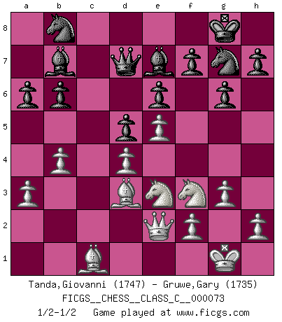 Last move : 1/2-1/2 2008 May 18 19:18:1 [Event "FICGS__CHESS__CLASS_C__000073"] [Site "FICGS"] [Date "2008.02.10"] [Round "1"] [White "Tanda,Giovanni"] [Black "Gruwe,Gary"] [Result "1/2-1/2"] [WhiteElo "1747"] [BlackElo "1735"] 1.d4 Nf6 2.Nf3 e6 3.e3 c5 4.c3 b6 5.Nbd2 Bb7 6.Bd3 Be7 7.O-O Nc6 8.a3 O-O 9.e4 cxd4 10.cxd4 Rc8 11.b4 a6 12.Bb2 d5 13.e5 Nh5 14.g3 g6 15.Qe2 Nb8 16.Rac1 Ng7 17.Rxc8 Qxc8 18.Rc1 Qd7 19.Nf1 Rc8 20.Ne3 Rxc1+ 21.Bxc1 1/2-1/2 Queen's pawn : Yusupov-Rubinstein system Kingside Castling by player White (move 7) Kingside Castling by player Black (move 8) This chess game ended in a draw. Follow this game move after move (download)An attack on the wing should be met by play in the center. (Nimzovitch) Garry Kasparov war erst in der Großmeister-Organisation GMA, dann in der Profischach-Vereinigung PCA, zum Schluss kehrte er wieder in den Schoß der FIDE zurück. Aber gut, manche Leute sind flexibel (Viswanathan Anand) Ciertamente, de todas la drogas del mundo, el Ajedrez debe ser el mas placentero permamentemente. (Assiac) Un journaliste : 'Vous préférez avoir une dame de plus sur l'échiquier ou au lit ?' Boris Spassky : 'Ca dépend de la position.' All the troubles of the world come from being unable to sit alone in a quiet room. (Blaise Pascal)