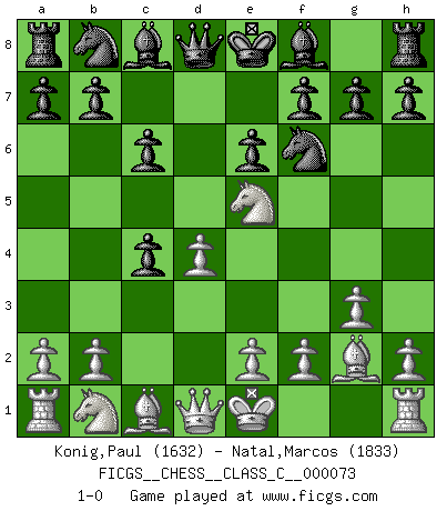 Last move : 1-0 2008 April 5 18:59:16 [Event "FICGS__CHESS__CLASS_C__000073"] [Site "FICGS"] [Date "2008.02.10"] [Round "1"] [White "Konig,Paul"] [Black "Natal,Marcos"] [Result "1-0"] [WhiteElo "1632"] [BlackElo "1833"] 1.c4 Nf6 2.Nf3 e6 3.g3 c6 4.Bg2 d5 5.d4 dxc4 6.Ne5 1-0 This chess game has been lost on time (started : 2008.02.10 18:25:43) English Opening Player White won this chess game. Follow this game move after move (download)When you play Bobby, it is not a question if you win or lose. It is a question if you survive. (Boris Spassky) Mutter, ich bin eben Ex-Weltmeister geworden. --beim nach Hause Kommen nach dem Verlust des WM-Titels an Mihail Botvinnik -- (Mikhail Nekhemyevich Tal) No puedes jugar al Ajedrez si eres de corazón noble. (Proverbio Francés) Psychologiquement, tu dois avoir confiance en toi même, mais cette confiance doit être basée sur des faits. (Robert Fischer) A person who never made a mistake never tried anything new. (Albert Einstein)