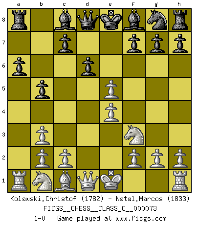 Last move : 1-0 2008 March 31 18:42:57 [Event "FICGS__CHESS__CLASS_C__000073"] [Site "FICGS"] [Date "2008.02.10"] [Round "1"] [White "Kolawski,Christof"] [Black "Natal,Marcos"] [Result "1-0"] [WhiteElo "1782"] [BlackElo "1833"] 1.e4 e5 2.Nf3 Nc6 3.Bb5 a6 4.Ba4 b5 5.Bb3 d6 6.d4 Na5 7.dxe5 Nxb3 8.axb3 1-0 This chess game has been lost on time (started : 2008.02.10 18:25:43) Ruy Lopez : Caro variation Player White won this chess game. Follow this game move after move (download)Chess is everything: art, science and sport. (Anatoly Karpov) Korrekt heißt in Deutschland die Haltung eines Mannes, dessen Benehmen nach dem Urteile seiner Nachbarn seiner Stellung angemessen ist. Um korrekt zu sein, muß man sich der Meinung der anderen anpassen... (Emanuel Lasker) El Ajedrez detiene a su maestro dentro de sus propios vínculos, encadenando la mente y el cerebro, por lo que la libertad interior del mas fuerte debe sufrir. (Albert Einstein) J'ai vu le vaincu d'Echecs jouer des années durant dans l'espoir de la fête de la victoire. Car tu es plus riche de ce qu'elle existe si même elle n'est point pour toi. Ainsi de la perle du fond des mers. (Antoine de Saint-Exupéry) A computer lets you make more mistakes faster than any invention in human history - with the possible exceptions of handguns and tequila. (Mitch Ratcliffe)