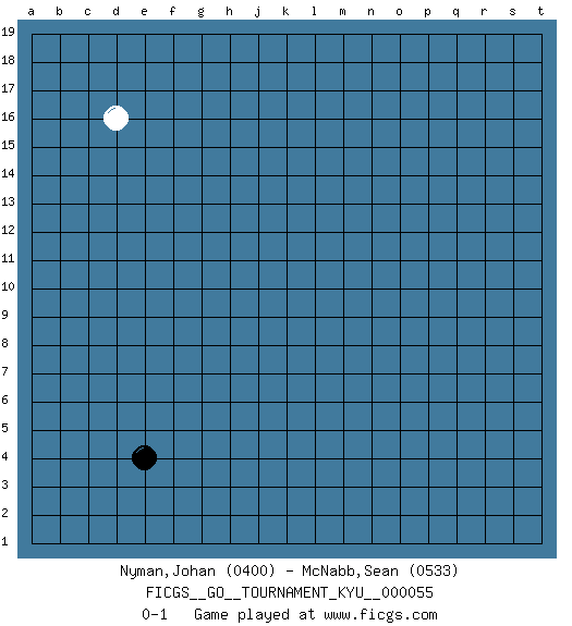 Last move : 0-1 2008 March 15 4:20:18 [Event "FICGS__GO__TOURNAMENT_KYU__000055"] [Site "FICGS"] [Date "2008.02.11"] [Round "1"] [Black "Nyman,Johan"] [White "McNabb,Sean"] [Result "0-1"] [Rating 1 "0400"] [Rating 2 "0533"] 1.e4 d16 0-1 This go game has been lost on time (started : 2008.02.11 2:7:42) Here are the names of the openings (joseki) played in the four corners : Player White won this Go (weiqi, baduk) game. Follow this game move after move (download)Beware of the clumsy double contact. (Anonymous) Chess is everything: art, science and sport. (Anatoly Karpov)