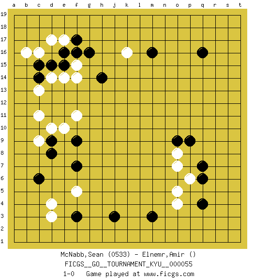 Last move : 1-0 2008 March 16 6:53:42 [Event "FICGS__GO__TOURNAMENT_KYU__000055 "] [Site "FICGS"] [Date "2008.02.11"] [Round "1"] [Black "McNabb,Sean "] [White "Elnemr,Amir "] [Result "1-0"] [Rating 1 "0533"] 1.q16 d4 2.q4 c16 3.e16 e17 4.f17 d17 5.g16 f15 6.e15 f14 7.f16 e14 8.c15 d14 9.c14 c13 10.d15 b16 11.h14 d10 12.f3 d3 13.j3 f5 14.f9 f11 15.d9 c9 16.d8 c11 17.c6 e10 18.f7 k16 19.m16 o4 20.m3 o5 21.q6 p6 22.q7 o7 23.p9 o8 24.o9 1-0 Here are the names of the openings (joseki) played in the four corners : Corner d16 : c16 e16Komoku (Somok, Xiao~mu`) 3-4 Point. The komoku (3-4) point is the traditional corner enclosure move..Ikken Takagakari (Hankan Nop'dakeolch'im, Yi Gaogua`jiao~, 1-Space High Approach). The 5-4 approach move has become more popular in modern times, as modern Go emphasizes speed and influence. Corner d4 : d4 f3Hoshi (Hwajeom, Seongjeom, Xingwei`) 4-4 Point. The star or hoshi (4-4) point, emphasizing influence at the potential expense of territory.Ikken Kakari (Hankan Keolch'im, Yi Gua`jiao~, 1-Space Low Approach). Black 2 is the standard approach move to the 4-4. Corner q4 : q4 o4Hoshi (Hwajeom, Seongjeom, Xingwei`) 4-4 Point. The star or hoshi (4-4) point, emphasizing influence at the potential expense of territory.Ikken Takagakari (Hankan Nop'dakeolch'im, Yi Gaojia, 1-Space High Approach). Black typically responds at 6-4 or 3-10. Black 4-10 is played when Black finds play on the right side advantageous. Black 4-8 or 3-8 may be played when Black has support at top. Player Black won this Go (weiqi, baduk) game.Follow this game move after move (download ) Five liberties for tactical stability. (Anonymous) Wisdom is the reward you get for a lifetime of listening when you'd have preferred to talk. (Doug Larson)