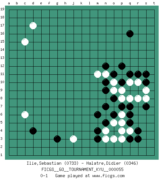 Last move : 0-1 2008 April 28 8:48:30 [Event "FICGS__GO__TOURNAMENT_KYU__000055"] [Site "FICGS"] [Date "2008.02.11"] [Round "1"] [Black "Ilie,Sebastian"] [White "Halatre,Didier"] [Result "0-1"] [Rating 1 "0733"] [Rating 2 "0346"] 1.q16 d17 2.q3 o3 3.d4 c6 4.g3 j3 5.m3 n3 6.m4 q4 7.r4 p3 8.q5 p4 9.r3 p5 10.q6 p6 11.q7 c15 12.p7 o7 13.o8 p8 14.n7 n6 15.o6 o5 16.m6 o7 17.n5 n4 18.o6 o9 19.n9 p9 20.q11 q10 21.r11 r10 22.o11 r8 23.s7 s8 24.s10 s9 25.s11 p11 26.p12 o10 27.n10 q8 28.p10 n11 29.n12 m11 0-1 This go game has been lost on time (started : 2008.02.11 2:7:42) Here are the names of the openings (joseki) played in the four corners : Corner q4 : q3 o3 Komoku (Somok, Xiao~mu`) 3-4 Point. The komoku (3-4) point is the traditional corner enclosure move.. Corner d4 : d4 c6 Hoshi (Hwajeom, Seongjeom, Xingwei`) 4-4 Point. The star or hoshi (4-4) point, emphasizing influence at the potential expense of territory. Ikken Kakari (Hankan Keolch'im, Yi Gua`jiao~, 1-Space Low Approach). White 2 is the standard approach move to the 4-4. Player White won this Go (weiqi, baduk) game. Follow this game move after move (download)Each step in a ladder is worth 7 points. (Anonymous) The meaning of life is that it is to be lived, and it is not to be traded and conceptualized and squeezed into a pattern of systems. (Bruce Lee)