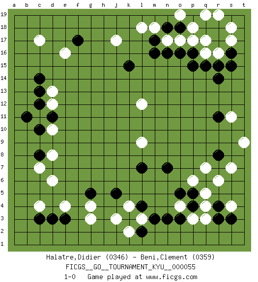 Last move : 1-0 2008 June 19 12:43:51 [Event "FICGS__GO__TOURNAMENT_KYU__000055"] [Site "FICGS"] [Date "2008.02.11"] [Round "1"] [Black "Halatre,Didier"] [White "Beni,Clement"] [Result "1-0"] [Rating 1 "0346"] [Rating 2 "0359"] 1.d3 r16 2.r3 c17 3.c14 d10 4.c8 c4 5.c3 d6 6.c10 e16 7.f17 l3 8.n3 d13 9.c13 n17 10.r14 r6 11.r8 s7 12.r11 j17 13.s16 s17 14.s15 g3 15.r17 q17 16.r18 q16 17.q18 c11 18.c12 d12 19.b11 p18 20.o18 o17 21.n18 l18 22.m17 m18 23.n16 o19 24.m16 s18 25.p15 r19 26.p16 t9 27.q15 p17 28.o16 s11 29.r15 q19 30.l4 k4 31.k3 j3 32.m3 k2 33.l2 p3 34.p4 s4 35.s3 o4 36.o3 d8 37.g5 c7 38.d11 q4 39.p5 q3 40.r4 q5 41.q6 p6 42.o5 e4 43.e3 l9 44.l7 q7 45.n7 g4 46.j5 l12 47.k15 1-0 This go game has been lost on time (started : 2008.02.11 2:7:42) Here are the names of the openings (joseki) played in the four corners : Corner d16 : c17 c14 San-San (Sam-Sam, San-San) 3-3 Point. The San-San (3-3) point, emphasizing territory at the expense of influence. Nikken Kakari (Dukan Keolch'im, E`r Gua`jiao~, 2-Space Low Approach). White can thwart Black's strategy with a play at 9-4. Corner q4 : r3 l3 San-San (Sam-Sam, San-San) 3-3 Point. The San-San (3-3) point, emphasizing territory at the expense of influence. Player Black won this Go (weiqi, baduk) game. Follow this game move after move (download)Stop on second, extend on third. (Anonymous) Memory is a complicated thing, a relative to truth, but not its twin. (Barbara Kingsolver, Animal Dreams)
