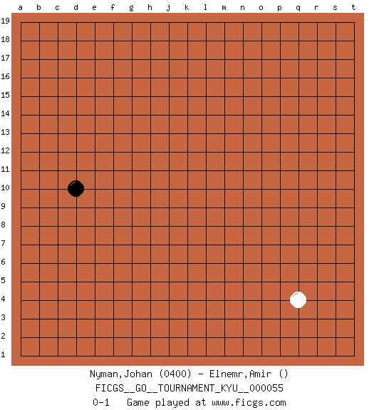 Last move : 0-1 2008 March 16 4:23:50 [Event "FICGS__GO__TOURNAMENT_KYU__000055"] [Site "FICGS"] [Date "2008.02.11"] [Round "1"] [Black "Nyman,Johan"] [White "Elnemr,Amir"] [Result "0-1"] [Rating 1 "0400"] 1.d10 q4 0-1 This go game has been lost on time (started : 2008.02.11 2:7:42) Here are the names of the openings (joseki) played in the four corners : Corner q4 : q4 0-1 Hoshi (Hwajeom, Seongjeom, Xingwei`) 4-4 Point. The star or hoshi (4-4) point, emphasizing influence at the potential expense of territory. Player White won this Go (weiqi, baduk) game. Follow this game move after move (download)Very few good moves are played. (Pierre Audouard) All the biggest technological inventions created by man - the airplane, the automobile, the computer - says little about his intelligence, but speaks volumes about his laziness. (Mark Kennedy)