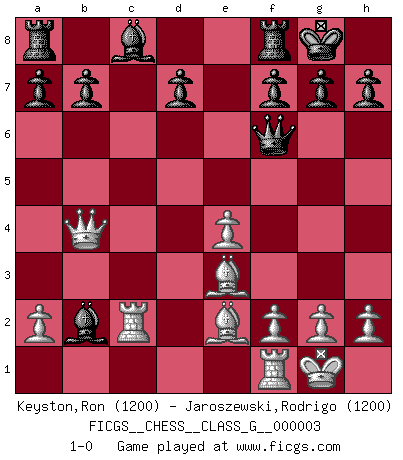 Last move : 1-0 2006 September 12 12:52:33 [Event "FICGS__CHESS__CLASS_G__000003"] [Site "FICGS"] [Date "2006.07.04"] [Round "1"] [White "Keyston,Ron"] [Black "Jaroszewski,Rodrigo"] [Result "1-0"] [WhiteElo "1200"] [BlackElo "1200"] 1.e4 c5 2.d4 cxd4 3.c3 dxc3 4.Nxc3 e5 5.Nf3 Nc6 6.Bc4 Bb4 7.O-O Nf6 8.Nd5 Bd6 9.Qd3 Nxd5 10.Qxd5 Qf6 11.Bg5 Qg6 12.Rac1 Bc7 13.Be3 O-O 14.Be2 Nb4 15.Nxe5 Qf6 16.Qc4 Bxe5 17.Qxb4 Bxb2 18.Rc2 1-0 Sicilian : Smith-Morra gambit Kingside Castling by player White (move 7) Kingside Castling by player Black (move 13) Player White won this chess game. Follow this game move after move (download)The King is a fighting piece. Use it ! (Wilhelm Steinitz) Der zweitbeste Zug ist oft der einzig richtige. (Savielly Grigorievitsch Tartakower) EL Ajedrez es como la vida. (Boris Spassky) La tactique est l'élément le plus important du milieu de jeu. (Siegbert Tarrasch) Life doesn't imitate art, it imitates bad television. (Woody Allen)