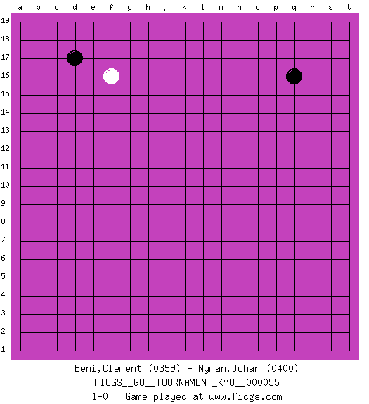Last move : 1-0 2008 March 15 4:20:18 [Event "FICGS__GO__TOURNAMENT_KYU__000055"] [Site "FICGS"] [Date "2008.02.11"] [Round "1"] [Black "Beni,Clement"] [White "Nyman,Johan"] [Result "1-0"] [Rating 1 "0359"] [Rating 2 "0400"] 1.q16 f16 2.d17 1-0 This go game has been lost on time (started : 2008.02.11 2:7:42) Here are the names of the openings (joseki) played in the four corners : Corner d16 : f16 d17 Ootakamoku (Chaogao) 6-4 Point. The large takamoku (high) point (6-4), experimented with during the "new fuseki" movement in Japan in the 1930's. This point is seldom played as the initial corner point nowadays. Player Black won this Go (weiqi, baduk) game. Follow this game move after move (download)Five groups might live but the six will die. (Anonymous) I've lost money so fast in these clubs it's left me reeling. I've read every poker book ever written, but the only way to get better at the game is to go out and play with people who are really good. The problem is, you stand to lose a lot of money doing it. (Matt Damon)