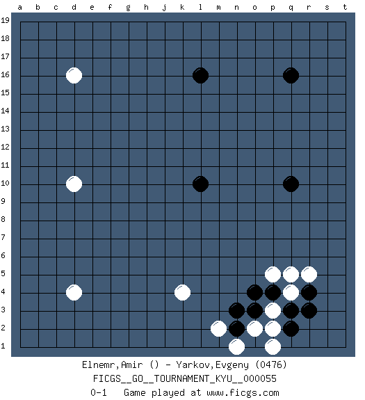 Last move : 0-1 2008 March 16 6:54:14 [Event "FICGS__GO__TOURNAMENT_KYU__000055"] [Site "FICGS"] [Date "2008.02.11"] [Round "1"] [Black "Elnemr,Amir"] [White "Yarkov,Evgeny"] [Result "0-1"] [Rating 2 "0476"] 1.r3 d16 2.q16 d4 3.q10 d10 4.l16 k4 5.l10 q4 6.q3 p3 7.q2 p2 8.p4 p5 9.o4 q5 10.r4 r5 11.o3 o2 12.n2 n1 13.n3 m2 14.o1 p1 0-1 Here are the names of the openings (joseki) played in the four corners : Corner q4 : r3 q4 San-San (Sam-Sam, San-San) 3-3 Point. The San-San (3-3) point, emphasizing territory at the expense of influence. Kata-tsuki (shoulder hit). The shoulder-hit is the traditional answer to the 3-3. The direction of Black 3 depends on the positions on the side. Crawling once may be the premise for a follow-up move of sliding with a knight's move in the opposite direction. If Black plays 3 at 3-4 (to the right), the follow-on knight's move is then played at the top (e.g. 3-4, 4-5, 5-2). Black's knight's move reduces territory potential on the side it is played. Player White won this Go (weiqi, baduk) game. Follow this game move after move (download)Everything happens on a grid-engraved board with black and white pieces, but if that's all you see then you don't know Go. (Pierre Audouard) You lose, general Kenobi. (General Grievous in Star Wars ep.3)