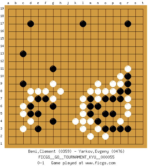 Last move : 0-1 2008 June 13 12:10:1 [Event "FICGS__GO__TOURNAMENT_KYU__000055"] [Site "FICGS"] [Date "2008.02.11"] [Round "1"] [Black "Beni,Clement"] [White "Yarkov,Evgeny"] [Result "0-1"] [Rating 1 "0359"] [Rating 2 "0476"] 1.r17 d4 2.d17 q4 3.l17 k4 4.c9 q10 5.r9 q9 6.r8 r7 7.r10 r11 8.q8 p8 9.q7 r6 10.p7 p9 11.o7 n7 12.n8 o8 13.o5 n9 14.n6 m8 15.m7 n8 16.m3 m4 17.n4 l5 18.m5 l4 19.p5 r5 20.p3 l7 21.m6 l6 22.r3 l3 23.q3 m2 24.c13 n3 25.o3 o2 26.g11 d8 27.g8 h8 28.g6 g9 29.g4 g7 30.f7 f8 31.e7 d7 32.e5 e8 33.d5 c3 34.e3 c5 35.d6 c6 0-1 This go game has been lost on time (started : 2008.02.11 2:7:42) Here are the names of the openings (joseki) played in the four corners : Corner d4 : d4 c9 Hoshi (Hwajeom, Seongjeom, Xingwei`) 4-4 Point. The star or hoshi (4-4) point, emphasizing influence at the potential expense of territory. Corner q4 : q4 r9 Hoshi (Hwajeom, Seongjeom, Xingwei`) 4-4 Point. The star or hoshi (4-4) point, emphasizing influence at the potential expense of territory. Player White won this Go (weiqi, baduk) game. Follow this game move after move (download)If a formation is symmetrical, play at the center. (Anonymous) Without deviation from the norm, progress is not possible. (Frank Zappa)