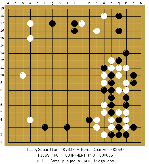 Last move : 0-1 2008 May 3 21:7:53 [Event "FICGS__GO__TOURNAMENT_KYU__000055 "] [Site "FICGS"] [Date "2008.02.11"] [Round "1"] [Black "Ilie,Sebastian "] [White "Beni,Clement "] [Result "0-1"] [Rating 1 "0733"] [Rating 2 "0359"] 1.q16 d4 2.q3 d17 3.f3 r5 4.r7 p4 5.q4 q5 6.p5 p3 7.p2 o5 8.p6 r3 9.r2 o6 10.p7 r4 11.q2 n3 12.j3 d15 13.k16 q8 14.r6 r8 15.o8 o2 16.s3 r11 17.r13 n16 18.g17 o18 19.q18 l17 20.k17 c10 21.m4 n4 22.s9 r9 23.s10 o10 24.p9 q10 25.p10 p11 26.q12 o9 27.p8 q11 28.o11 p12 0-1 This go game has been lost on time (started : 2008.02.11 2:7:42) Here are the names of the openings (joseki) played in the four corners : Corner d4 : d4 f3Hoshi (Hwajeom, Seongjeom, Xingwei`) 4-4 Point. The star or hoshi (4-4) point, emphasizing influence at the potential expense of territory.Ikken Kakari (Hankan Keolch'im, Yi Gua`jiao~, 1-Space Low Approach). Black 2 is the standard approach move to the 4-4. Corner q4 : q3 r5Komoku (Somok, Xiao~mu`) 3-4 Point. The komoku (3-4) point is the traditional corner enclosure move..Ikken Kakari (Hankan Keolch'im, Yi Gua`jiao~, 1-Space Low Pincer). The small knight move is the basic approach move to the 3-4 point stone. It has been continually used for over four centuries. There are limitless variations, with new moves constantly being discovered. White 2 opens the door to a treaure store of joseki. Corner q16 : q16 r11Hoshi (Hwajeom, Seongjeom, Xingwei`) 4-4 Point. The star or hoshi (4-4) point, emphasizing influence at the potential expense of territory. Player White won this Go (weiqi, baduk) game.Follow this game move after move (download ) Only amateurs try to come up with fancy moves. (Anonymous) The obstacle is the path. (Zen proverb)