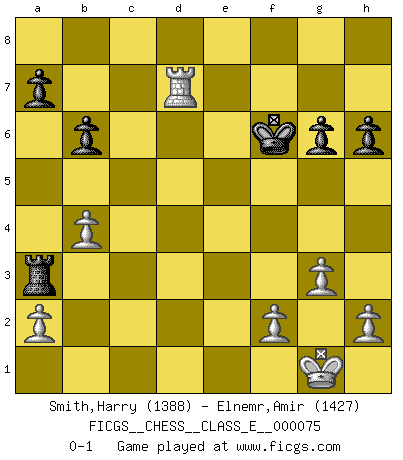 Last move : 0-1 2008 August 17 6:13:37 [Event "FICGS__CHESS__CLASS_E__000075"] [Site "FICGS"] [Date "2008.02.11"] [Round "1"] [White "Smith,Harry"] [Black "Elnemr,Amir"] [Result "0-1"] [WhiteElo "1388"] [BlackElo "1427"] 1.e4 e5 2.Nf3 d6 3.g3 Nf6 4.d3 Be7 5.Bg2 O-O 6.O-O Bd7 7.Re1 Nc6 8.d4 Bg4 9.d5 Nd4 10.c3 Nxf3+ 11.Bxf3 Bc8 12.Nd2 b6 13.Nc4 Bb7 14.Bg5 c6 15.Ne3 Nd7 16.Bxe7 Qxe7 17.Nf5 Qf6 18.dxc6 Bxc6 19.b4 Rad8 20.Qxd6 Qxd6 21.Nxd6 Nf6 22.Nf5 Rd3 23.Ne7+ Kh8 24.Nxc6 Rxf3 25.Rac1 Rc8 26.Nxe5 Rfxc3 27.Rxc3 Rxc3 28.Rd1 g6 29.Nxf7+ Kg7 30.Ng5 h6 31.Ne6+ Kf7 32.e5 Kxe6 33.exf6 Kxf6 34.Rd7 Ra3 0-1 Philidor's defense Kingside Castling by player Black (move 5) Kingside Castling by player White (move 6) Player Black won this chess game. Follow this game move after move (download)The stomach is an essential part of the Chess master. (Bent Larsen) Drei Punkte vor allen anderen ist wie einer, der im weißen Anzug posiert, während der Rest in Müllsäcke gekleidet dasteht. (Viktor Kortschnoi) Hoy en día, si tu no eres un Gran Maestro a los 14 años, es mejor que lo olvides. (Anand Viswanathan) Le plus grand jeu de l'esprit jamais inventé, plus vous l'apprenez, plus vous y prenez du plaisir. (Garry Kasparov) Life is pleasant. Death is peaceful. It's the transition that's troublesome. (Isaac Asimov)