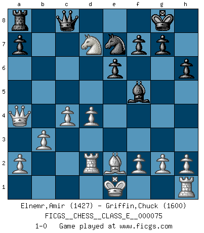 Last move : 1-0 2008 July 22 15:50:7 [Event "FICGS__CHESS__CLASS_E__000075"] [Site "FICGS"] [Date "2008.02.11"] [Round "1"] [White "Elnemr,Amir"] [Black "Griffin,Chuck"] [Result "1-0"] [WhiteElo "1427"] [BlackElo "1600"] 1.d4 d5 2.c4 c6 3.Nf3 Bf5 4.Nc3 e6 5.Qb3 Bd6 6.Qxb7 Nd7 7.Qxc6 Bb4 8.Qa4 Ba5 9.Bd2 Ne7 10.e4 dxe4 11.Nxe4 Bxe4 12.Bxa5 Bc2 13.b3 Qc8 14.Ne5 O-O 15.Nxd7 Rd8 16.Bxd8 Qxd8 17.Rc1 Bf5 18.Rd1 Bg4 19.Rd2 h6 20.Ne5 Bf5 21.Be2 Qc8 22.Nd7 1-0 This chess game has been lost on time (started : 2008.02.11 10:7:26) QGD Slav : 3.Nf3 Kingside Castling by player Black (move 14) Player White won this chess game. Follow this game move after move (download)One doesn't have to play well, it's enough to play better than your opponent. (Siegbert Tarrasch) Bis zum Jahr 1971 verlief in meiner Schachkariere alles glatt. Dieses dramatische Match [Fischer-Taimanov 6:0] machte mein Leben zur Hölle. (Mark Taimanov) Fischer era un maestro de claridad y un Rey del posicionamiento astuto. Sus oponentes podían ver hacia donde se dirigía pero eran impotentes para detenerlo. (Bruce Pandolfini) Votre seul travail dans les ouvertures est d'obtenir un milieu de partie jouable. (Lajos Portish) Experience is the name we all give to our mistakes. (Oscar Wilde)