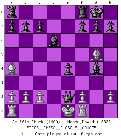 Last move : 0-1 2008 February 27 20:18:18 [Event "FICGS__CHESS__CLASS_E__000075"] [Site "FICGS"] [Date "2008.02.11"] [Round "1"] [White "Griffin,Chuck"] [Black "Moody,David"] [Result "0-1"] [WhiteElo "1600"] [BlackElo "1332"] 1.e4 e5 2.Nc3 Nc6 3.Nf3 Nf6 4.Bc4 Nxe4 5.Nxe4 d5 6.Bb5 dxe4 7.Nxe5 Qg5 8.d4 Qxg2 9.Rf1 Bd6 10.Qh5 O-O 11.Ng4 Bxg4 12.Qg5 Nxd4 13.Ba4 Nf3+ 14.Ke2 Nxg5 15.Ke1 Qf3 16.Bxg5 Qe2+ 0-1 Comment by player 1 : Chuck Griffin : Well played Vienna game, Max Lange defense Kingside Castling by player Black (move 10) Player Black won this chess game. Follow this game move after move (download)It is the aim of the modern school, not to treat every position according to one general law, but according to the principle inherent in the position. (Richard Reti) Darum geht es im Schach. Einen Tag gibst du deinem Gegner eine Lektion, am nächsten Tag gibt er dir eine. (Robert James Fischer) Con o sin el título, Bobby Fischer fue sin lugar a dudas el mas grande jugador de su época. (Burt Hochberg) La solitude du joueur d'Echecs à l'approche du mat est semblable à celle du condamné. (Francis Szpiner) Experiences are the keys to life. (Daniel Parmet)