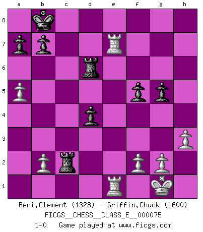 Last move : 1-0 2008 July 10 14:47:39 [Event "FICGS__CHESS__CLASS_E__000075"] [Site "FICGS"] [Date "2008.02.11"] [Round "1"] [White "Beni,Clement"] [Black "Griffin,Chuck"] [Result "1-0"] [WhiteElo "1328"] [BlackElo "1600"] 1.e4 d5 2.Nc3 Nf6 3.e5 Ng4 4.e6 Bxe6 5.Be2 Nc6 6.Bxg4 g6 7.Bxe6 fxe6 8.Nge2 Bh6 9.d3 Qd7 10.Bxh6 O-O-O 11.O-O e5 12.d4 Kb8 13.dxe5 Nxe5 14.Qd4 Nc6 15.Qf4 Qf5 16.Qxf5 gxf5 17.Nf4 d4 18.Ncd5 Rde8 19.Bg5 Ne5 20.Ne6 Nc6 21.Ndxc7 Rc8 22.Nd5 h6 23.a4 hxg5 24.a5 Rh6 25.h3 Rxe6 26.Rae1 Rd6 27.Nxe7 Nxe7 28.Rxe7 Rxc2 29.Rfe1 1-0 This chess game has been lost on time (started : 2008.02.11 10:7:26) Scandinavian (centre counter) defense Queenside Castling by player Black (move 10) Kingside Castling by player White (move 11) Player White won this chess game. Follow this game move after move (download)Chess is a terrible game. If you have no center, your opponent has a freer position. If you do have a center, then you really have something to worry about ! (Siegbert Tarrasch) Schach ist mein Leben, meine Leidenschaft, was ich gelernt habe und seit meinem 14. Lebensjahr profimässig praktiziere. Darauf zu verzichten, würde mir sehr schwer fallen. (Viktor Kortschnoi) Algunos sacrificios son sólidos, los demás son míos. (Mikhail Tal) D'abord les bases : Jouez et étudiez, puis étudiez et jouez, ensuite jouez et étudiez, puis étudiez et jouez. Deuxièmement : Donnez toujours le meilleur de vous-même ! (Ken Smith) When you don't know what to do, walk fast and look worried. (Anonymous)