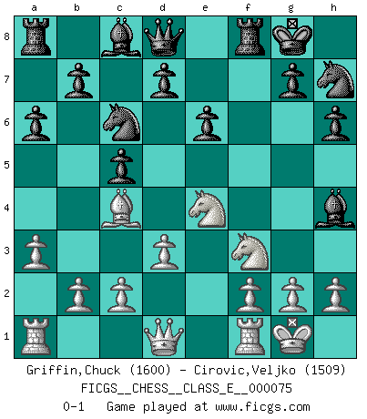 Last move : 0-1 2008 June 20 0:48:51 [Event "FICGS__CHESS__CLASS_E__000075"] [Site "FICGS"] [Date "2008.02.11"] [Round "1"] [White "Griffin,Chuck"] [Black "Cirovic,Veljko"] [Result "0-1"] [WhiteElo "1600"] [BlackElo "1509"] 1.e4 c5 2.Nc3 Nc6 3.Bc4 e6 4.Nf3 Be7 5.d3 Nf6 6.O-O O-O 7.Bf4 a6 8.e5 Ne8 9.a3 f6 10.exf6 Nxf6 11.Bg5 h6 12.Bh4 Nh7 13.Ne4 Bxh4 0-1 This chess game has been lost on time (started : 2008.02.11 10:7:26) Sicilian : Closed, 2...Nc6 Kingside Castling by player White (move 6) Kingside Castling by player Black (move 6) Player Black won this chess game. Follow this game move after move (download)Best by test: 1. e4 (Bobby Fischer) Schach ist wie eine schöne Frau, zu der wir ständig zurückkehren, gleichviel, wie oft sie uns zurückweist. (Anonymous) Tu no necesitas jugar muy bien, únicamente ayudar a tu oponenet a que juegue muy mal. (Genrikh Chepukaitis) Les Echecs sont affaire de jugement sensible. Savoir quand frapper et quand esquiver. (Fischer) Inventor: A person who makes an ingenious arrangement of wheels, levers and springs, and believes it civilization. (Ambrose Bierce, The Devil's Dictionary)
