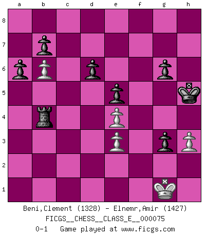 Last move : 0-1 2008 April 28 0:15:36 [Event "FICGS__CHESS__CLASS_E__000075"] [Site "FICGS"] [Date "2008.02.11"] [Round "1"] [White "Beni,Clement"] [Black "Elnemr,Amir"] [Result "0-1"] [WhiteElo "1328"] [BlackElo "1427"] 1.e4 e5 2.Nf3 Nc6 3.Nc3 g6 4.Bb5 Bg7 5.Nd5 Nd4 6.d3 Nxb5 7.Bg5 f6 8.Bd2 d6 9.O-O Ne7 10.a4 Nxd5 11.axb5 Nb6 12.Re1 f5 13.Bg5 Bf6 14.Qd2 fxe4 15.dxe4 Bg4 16.Re3 Nc4 17.Qc3 Nxe3 18.Bxf6 Qxf6 19.Qxe3 O-O 20.c4 Bxf3 21.Qxf3 Qg5 22.Qh3 Rf6 23.Qe3 Qxe3 24.fxe3 Raf8 25.h3 h5 26.b4 h4 27.c5 Rf2 28.cxd6 cxd6 29.Re1 Rb2 30.b6 a6 31.Rf1 Rxf1+ 32.Kxf1 Kh7 33.Kg1 Kh6 34.Kf1 Kh5 35.Kg1 Rxb4 36.g4+ hxg3 0-1 Three knights : Steinitz variation Kingside Castling by player White (move 9) Kingside Castling by player Black (move 19) Player Black won this chess game. Follow this game move after move (download)The older I grow, the more I value pawns. (Paul Keres) Rauchen ist dem Schachspieler bei seiner Arbeit, also im Wettkampf, untersagt. (Viktor Kortschnoi) El Ajedrez lo es todo: arte, ciencia y deporte. (Anatoly Karpov) Si rien de grave n'est détecté lors de l'analyse d'une position, on joue alors le coup. Seconde règle de Blumenfeld. It's not a bug - it's an undocumented feature. (Anonymous)