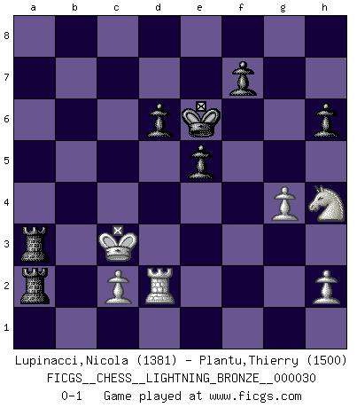 Last move : 0-1 2008 July 27 22:33:15 [Event "FICGS__CHESS__LIGHTNING_BRONZE__000030"] [Site "FICGS"] [Date "2008.07.27"] [Round "1"] [White "Lupinacci,Nicola"] [Black "Plantu,Thierry"] [Result "0-1"] [WhiteElo "1381"] [BlackElo "1500"] 1.e4 Nf6 2.e5 Nd5 3.d4 d6 4.exd6 cxd6 5.Bb5+ Nc6 6.Qf3 Nf6 7.d5 a6 8.dxc6 axb5 9.cxb7 Bxb7 10.Qxb7 Rb8 11.Qf3 e5 12.Bg5 Be7 13.Nc3 h6 14.Bxf6 Bxf6 15.Nd5 Rc8 16.Nxf6+ Qxf6 17.Qxf6 gxf6 18.O-O-O Ke7 19.Nf3 Ra8 20.Kb1 Ra7 21.Nh4 Ke6 22.Rhe1 Rha8 23.a3 b4 24.f4 bxa3 25.bxa3 Rxa3 26.fxe5 fxe5 27.Rd3 Ra1+ 28.Kb2 Rxe1 29.Rd2 Rea1 30.g4 R1a2+ 31.Kc3 R8a3+ 0-1 Alekhine's defense Queenside Castling by player White (move 18) Player Black won this chess game. Follow this game move after move (download)For me, Chess is life and every game is like a new life. Every Chess player gets to live many lives in one lifetime. (Eduard Gufeld) Du kannst im Schach nur gut werden, wenn du das Spiel liebst. (Robert James Fischer) El ganar no lo es todo... pero el perder es nada. (Mednis) Il n'y a pas eu de défaite parce que je ne crois pas que cet ordinateur ait jamais existé. IBM a triché en refusant d'imprimer les modes de recherche de la machine. C'est évident, pendant le match, des coups décisifs ont été joués par des êtres humains. Aujourd'hui, les meilleurs spécialistes en informatique ne peuvent toujours pas expliquer comment Deep-Blue a pu jouer contre la logique des ordinateurs. IBM a gagné une guerre de communication, mais ils sont incapables de prouver que l'ordinateur a gagné tout seul. (Garry Kasparov) The greatest con, that he ever pulled... was making you believe... that he is you. (Revolver, movie)