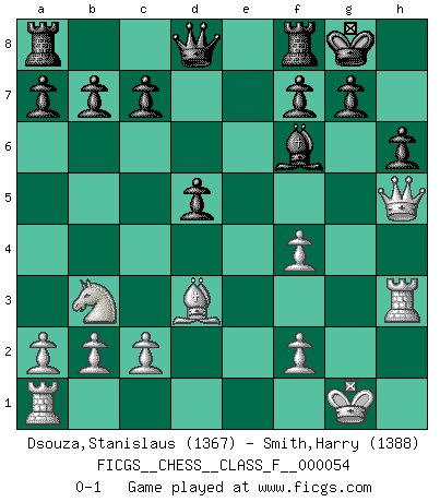 Last move : 0-1 2008 June 18 0:39:39 [Event "FICGS__CHESS__CLASS_F__000054"] [Site "FICGS"] [Date "2008.02.14"] [Round "1"] [White "Dsouza,Stanislaus"] [Black "Smith,Harry"] [Result "0-1"] [WhiteElo "1367"] [BlackElo "1388"] 1.d4 e6 2.e4 d5 3.exd5 exd5 4.Be3 Nf6 5.Bd3 Bd6 6.Nd2 O-O 7.Ngf3 Nc6 8.O-O Bg4 9.h3 Bxh3 10.Bg5 Bg4 11.Re1 Nxd4 12.Nb3 Nxf3+ 13.gxf3 Bh3 14.f4 Be7 15.Bxf6 Bxf6 16.Qh5 h6 17.Re3 Bh4 18.Rxh3 Bf6 0-1 This chess game has been lost on time (started : 2008.02.14 12:40:4) Queen's pawn Kingside Castling by player Black (move 6) Kingside Castling by player White (move 8) Player Black won this chess game. Follow this game move after move (download)First-class players lose to second class players because second-class players sometimes play a first-class game. (Tarrasch) Ich verachte Kasparow. (Viktor Kortschnoi) El Ajedrez detiene a su maestro dentro de sus propios vínculos, encadenando la mente y el cerebro, por lo que la libertad interior del mas fuerte debe sufrir. (Albert Einstein) Les ravages du H expliquent la différence de niveau entre Tal et Thal [Abergel]. To send light into the darkness of men's hearts - such is the duty of the artist. (Schumann)