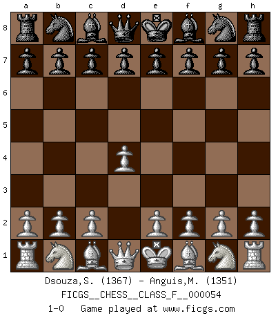 Last move : 1-0 2008 March 27 5:9:15 [Event "FICGS__CHESS__CLASS_F__000054"] [Site "FICGS"] [Date "2008.02.14"] [Round "1"] [White "Dsouza,Stanislaus"] [Black "Anguis,Miquel Angel"] [Result "1-0"] [WhiteElo "1367"] [BlackElo "1351"] 1.d4 1-0 This chess game has been lost on time (started : 2008.02.14 12:40:4) Queen's pawn Player White won this chess game. Follow this game move after move (download)Chess is a forcing house where the fruits of character can ripen more fully than in life. (Edward Morgan Foster) Besser ein falscher Plan, logisch durchgeführt, als gar kein Plan. (Viktor Kortschnoi) Un juego de Ajedrez es un dialogo, una conversación entre un jugador y su oponente. Cada movimiento del oponente puede contener amenazas o tropiezos, pero un jugador no se puede defender de las amenazas o tomar ventaja de los tropiezos si es que no se pregunta a sí mismo: ¿Que es lo que mi oponente va a hacer después de cada movida?. (Bruce A. Moon) Une platitude souvent récitée à propos des Echecs est qu'une des choses les plus difficiles à réaliser est de gagner une position gagnante. Cela ne manque pas de sens mais, pour ma part, j'ai toujours trouvé plus difficile de gagner une position perdante. (Tim Krabbe) Patience, use the Force, think ! (Obi-Wan Kenobi in Star Wars ep.2)