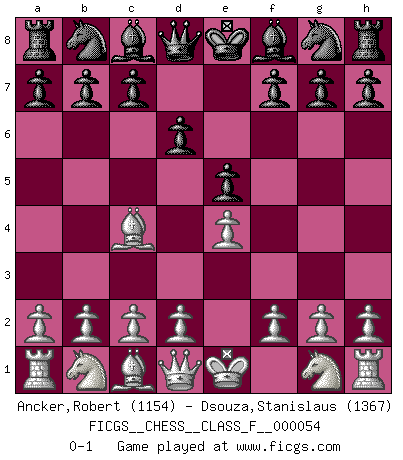 Last move : 0-1 2008 March 29 5:19:14 [Event "FICGS__CHESS__CLASS_F__000054"] [Site "FICGS"] [Date "2008.02.14"] [Round "1"] [White "Ancker,Robert"] [Black "Dsouza,Stanislaus"] [Result "0-1"] [WhiteElo "1154"] [BlackElo "1367"] 1.e4 e5 2.Bc4 d6 0-1 This chess game has been lost on time (started : 2008.02.14 12:40:4) Bishop's Opening Player Black won this chess game. Follow this game move after move (download)Strategy requires thought, tactics require observation. (Max Euwe) Stil? Ich habe keinen Stil! (Anatoly Karpov) El Ajedrez es parte de una cultura y si una cultura esta en decadencia, entonces también el Ajedrez declinará. (Mikhail Botvinnik) Dieu déplace le joueur, et celui-ci la pièce. Quel Dieu derrière Dieu commence donc la trame ? Arturo Perez-Reverte (prix de littérature policière 1993). The intuitive mind is a sacred gift; the rational mind is a faithful servant. We have created a society that honors the servant but has forgotten the gift. (Albert Einstein)