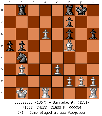 Last move : 0-1 2008 June 25 1:20:38 [Event "FICGS__CHESS__CLASS_F__000054"] [Site "FICGS"] [Date "2008.02.14"] [Round "1"] [White "Dsouza,Stanislaus"] [Black "Barradas,Anderson"] [Result "0-1"] [WhiteElo "1367"] [BlackElo "1251"] 1.d4 d5 2.c4 c6 3.b3 Nf6 4.Nc3 e6 5.Bg5 h6 6.Bh4 Be7 7.Nf3 Bb4 8.Bxf6 Qxf6 9.Qc2 O-O 10.e3 dxc4 11.O-O-O cxb3 12.Qxb3 Na6 13.Ne4 Qe7 14.Bc4 b5 15.Bd3 Ba3+ 16.Kb1 e5 17.Nxe5 Be6 18.Nxc6 Bxb3 19.Nxe7+ Bxe7 20.axb3 Rab8 21.d5 Nb4 22.d6 Bf6 23.Nxf6+ gxf6 24.Bf5 a5 0-1 QGD Slav defense Kingside Castling by player Black (move 9) Queenside Castling by player White (move 11) Player Black won this chess game. Follow this game move after move (download)Weak points or holes in the opponent's position must be occupied by pieces not Pawns. (Siegbert Tarrasch) Zu meiner Zeit war ein 20 jähriger ein junger Spieler, heute ist er ein Veteran. (Garry Kasparov) En partidas rápidas, el Caballo es mas poderoso que el Alfil. (Vlastimil Hort) Votre seul travail dans les ouvertures est d'obtenir un milieu de partie jouable. (Lajos Portish) Quotation,n.: The act of repeating erroneously the words of another. The words erroneously repeated. (Ambrose Bierce, The Devil's Dictionary)