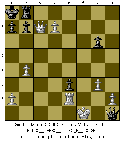 Last move : 0-1 2008 May 17 18:4:51 [Event "FICGS__CHESS__CLASS_F__000054"] [Site "FICGS"] [Date "2008.02.14"] [Round "1"] [White "Smith,Harry"] [Black "Hess,Volker"] [Result "0-1"] [WhiteElo "1388"] [BlackElo "1319"] 1.e4 d6 2.Nf3 Nf6 3.d3 e5 4.g3 Be7 5.Bg2 Nc6 6.O-O Bg4 7.Nc3 Nd4 8.Bg5 Nh5 9.Bxe7 Qxe7 10.Nd5 Qd7 11.c3 Nxf3+ 12.Bxf3 Bxf3 13.Qxf3 O-O-O 14.Qxh5 g6 15.Qf3 h5 16.d4 h4 17.Nf6 Qe6 18.d5 Qe7 19.Ng4 Kb8 20.c4 Rdf8 21.Qf6 Qd7 22.b4 Qxg4 23.c5 hxg3 24.fxg3 Qe2 25.Rf2 Qxe4 26.cxd6 Qd4 27.dxc7+ Kxc7 28.Rc1+ Kb8 29.d6 Rd8 30.Qxf7 Rhf8 31.Qc7+ Ka8 32.Rcf1 Rb8 33.d7 Rxf2 34.Rxf2 e4 35.Kg2 e3 36.Re2 Qe4+ 37.Kf1 Qh1+ 0-1 King's pawn Opening Kingside Castling by player White (move 6) Queenside Castling by player Black (move 13) Player Black won this chess game. Follow this game move after move (download)Chess is above all, a fight ! (Emanuel Lasker) Woher wissen wir, daß der Neanderthaler Blindschach gespielt hat? -- Bei Ausgrabungen wurden keine Schachbretter und Figuren gefunden. (Anonymous) Durante una competencia de Ajedrez, un Maestro de Ajedrez deberá ser una combinación de presa de caza y un Monge. (Alexander Alekhine) Ce qui caractérise les parties de combat, c'est que si le défenseur a constamment de difficiles problèmes à résoudre, l'attaquant doit chercher sans relâche de nouvelles possibilités d'attaque. (Koblentz) The human is the only animal species whose members are able to talk themselves into difficulties that would not otherwise exist. (Wendell Johnson)
