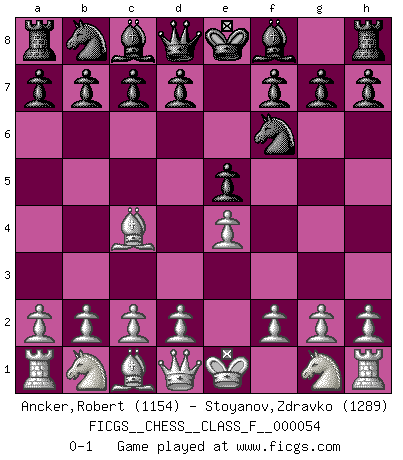 Last move : 0-1 2008 March 28 5:16:33 [Event "FICGS__CHESS__CLASS_F__000054"] [Site "FICGS"] [Date "2008.02.14"] [Round "1"] [White "Ancker,Robert"] [Black "Stoyanov,Zdravko"] [Result "0-1"] [WhiteElo "1154"] [BlackElo "1289"] 1.e4 e5 2.Bc4 Nf6 0-1 This chess game has been lost on time (started : 2008.02.14 12:40:4) Bishop's Opening : Berlin defense Player Black won this chess game. Follow this game move after move (download)It's always better to sacrifice your opponent's men. (Savielly Tartakover) Der Vorposten provoziert a) eine Basis für neue Angriffe und b) eine Schwächung der gegnerischen Widerstandskraft in der fraglichen Linie. (Aaron Nimzowitsch) Yo jugué Ajedrez con el y a veces le pude haber ganado solo que siempre devuelve su última jugada y juega la partida de manera diferente. (Mark Twain) Je ne crois pas en la psychologie, je crois aux bons coups. (Robert Fischer) I'll be back. (Arnold Schwarzenegger)