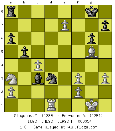 Last move : 1-0 2008 February 19 18:26:50 [Event "FICGS__CHESS__CLASS_F__000054"] [Site "FICGS"] [Date "2008.02.14"] [Round "1"] [White "Stoyanov,Zdravko"] [Black "Barradas,Anderson"] [Result "1-0"] [WhiteElo "1289"] [BlackElo "1251"] 1.e4 e5 2.Nf3 Nf6 3.d3 d5 4.exd5 Qxd5 5.h3 e4 6.Qe2 Be7 7.Ng5 exd3 8.Qxd3 Qe5+ 9.Be2 g6 10.Be3 a6 11.Qb3 O-O 12.O-O b5 13.Nf3 Qe6 14.Qxe6 fxe6 15.Nh2 Nbd7 16.Bf3 Nd5 17.Bh6 Rf7 18.b3 Bb7 19.c4 Bf6 20.cxd5 Bxa1 21.dxe6 Rxf3 22.Nxf3 Nc5 23.e7 Nd3 24.Bg5 Bxf3 25.gxf3 c5 26.Na3 Bc3 27.Rd1 c4 28.bxc4 1-0 Petrov's defense Kingside Castling by player Black (move 11) Kingside Castling by player White (move 12) Player White won this chess game. Follow this game move after move (download)My style is somewhere between that of Tal and Petrosian. (Reshevsky) Der zweitbeste Zug ist oft der einzig richtige. (Savielly Grigorievitsch Tartakower) El tablero es el mundo, las piezas es el fenomeno del universo, las reglas del juego son lo que llamamos leyes de la naturaleza y el jugador del lado opuesto, se encuentra oculto a nuestra vista. (Thomas Huxley) Si rien de grave n'est détecté lors de l'analyse d'une position, on joue alors le coup. Seconde règle de Blumenfeld. Have no fear of perfection - you'll never reach it. (Salvador Dali)