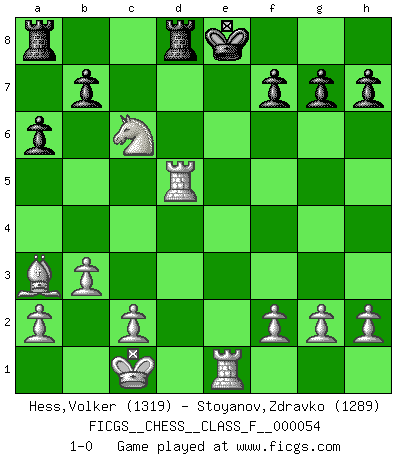 Last move : 1-0 2008 February 17 10:28:45 [Event "FICGS__CHESS__CLASS_F__000054"] [Site "FICGS"] [Date "2008.02.14"] [Round "1"] [White "Hess,Volker"] [Black "Stoyanov,Zdravko"] [Result "1-0"] [WhiteElo "1319"] [BlackElo "1289"] 1.e4 e5 2.Nf3 d6 3.d4 Bg4 4.dxe5 dxe5 5.Qxd8+ Kxd8 6.Nxe5 Be6 7.Nc3 Nf6 8.Bf4 Bb4 9.O-O-O Ke7 10.Nd5+ Nxd5 11.exd5 Bf5 12.Nc4 Rd8 13.Bxc7 Rc8 14.d6+ Bxd6 15.Bxd6+ Ke8 16.Bd3 Be6 17.b3 Nd7 18.Rhe1 Nf6 19.Ne5 Nd5 20.Bb5+ Kd8 21.Ba3 a6 22.Bc4 Ke8 23.Bxd5 Bxd5 24.Rxd5 Rd8 25.Nc6 1-0 Philidor's defense Queenside Castling by player White (move 9) Player White won this chess game. Follow this game move after move (download)No Chess Grandmaster is normal; they only differ in the extent of their madness. (Viktor Korchnoi) Mein erstes Ziel war nicht, die Partie zu gewinnen, sondern eine Figur zu opfern. -- der junge (Wilhelm Steinitz) El jugador blanco perdió porque fallo en recordar la coreccta continuación y tuvo que pensar por sí mismo las movidas. (Siegbert Tarrasch) On croit qu'il y a plus de mauvais joueurs que de bons joueurs, c'est faux : Il y a autant de joueurs qui gagnent que de joueurs qui perdent. (Philippe Geluck) The ultimate in disposing one's troops is to be without ascertainable shape. Then the most penetrating spies cannot pry in nor can the wise lay plans against you. (Sun Tzu)