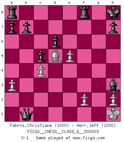Last move : 0-1 2006 November 4 20:10:39 [Event "FICGS__CHESS__CLASS_G__000003"] [Site "FICGS"] [Date "2006.07.04"] [Round "1"] [White "Fahrni,Christiane"] [Black "Herr,Jeff"] [Result "0-1"] [WhiteElo "1000"] [BlackElo "1200"] 1.e4 e5 2.Nf3 Nc6 3.Nc3 Nf6 4.d4 exd4 5.Bd3 dxc3 6.e5 Nd5 7.O-O Bb4 8.a3 cxb2 9.Bxb2 Ba5 10.Be4 Nc3 11.Qe1 Nd5 12.Qd1 Nf4 13.Bd4 Nxd4 14.Qxd4 Ne2+ 15.Kh1 Nxd4 16.Nxd4 Bc3 17.Rad1 c5 18.Nf5 Bxe5 19.Nxg7+ Bxg7 20.Rd3 O-O 21.Rh3 f5 22.Bd5+ Kh8 23.Re1 d6 24.Re5 Bxe5 25.c4 Qb6 26.g3 f4 27.gxf4 Bxh3 28.fxe5 Qb1+ 0-1 Four knights : Scotch, 4...exd4 Kingside Castling by player White (move 7) Kingside Castling by player Black (move 20) Player Black won this chess game. Follow this game move after move (download)There are tough players and nice guys, and I'm a tough player. (Bobby Fischer) Nicht daß Diemer aus Opportunismus Mitglied der NSDAP geworden wäre. Er war ein Fanatiker, in allem, was er tat. (Hans Ree) El Ajedrez es parte de una cultura y si una cultura esta en decadencia, entonces también el Ajedrez declinará. (Mikhail Botvinnik) Les échecs, c'est l'art d'analyser. (Mikhail Botvinnik) Winning isn't everything... but losing is nothing. (Mednis)