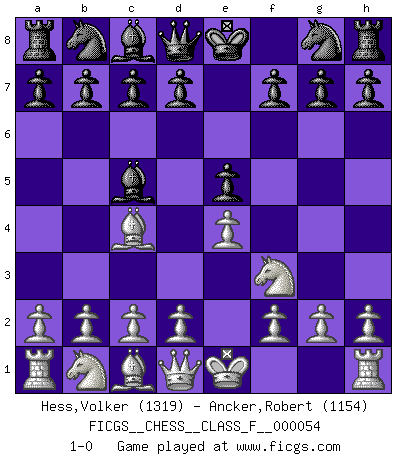 Last move : 1-0 2008 March 27 17:9:38 [Event "FICGS__CHESS__CLASS_F__000054"] [Site "FICGS"] [Date "2008.02.14"] [Round "1"] [White "Hess,Volker"] [Black "Ancker,Robert"] [Result "1-0"] [WhiteElo "1319"] [BlackElo "1154"] 1.e4 e5 2.Nf3 Bc5 3.Bc4 1-0 This chess game has been lost on time (started : 2008.02.14 12:40:4) King's knight Opening Player White won this chess game. Follow this game move after move (download)In complicated positions, Bobby Fischer hardly had to be afraid of anybody. (Paul Keres) Wer nie einen Fehler gemacht hat, hat nie etwas Neues ausprobiert. (Albert Einstein) Si pudieramos observar el interior de la cabeza de un jugador de Ajedrez, encontraríamos ahí un mundo lleno de sentimientos, imágenes, ideas, emoción y pasión. (Alfred Binet) Demandez au pauvre Cg1 ce qu'il en pense. Eduard Gufeld à propos de la variante Saemisch de l'Est-Indienne. You cannot beat a roulette table unless you steal money from it. (Albert Einstein)